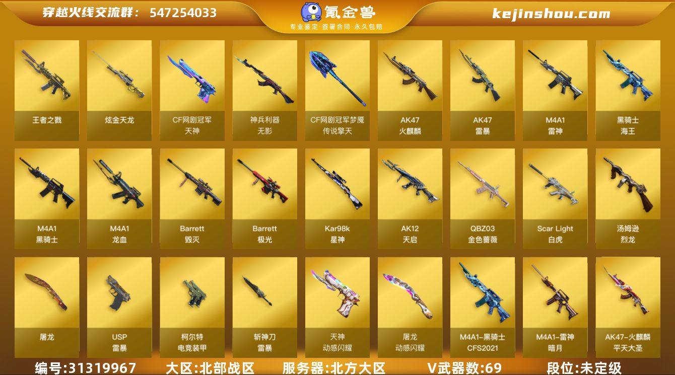 北方大区-73V-3王者武器数-2炫金武器数 【热门武器】:QBZ03-金色蔷薇,Scar Light-白虎,Kar98K-星神,M4A1-黑骑士,汤姆逊-烈龙*6,加特林-炼狱,斯泰尔-蝴蝶,USP-雷暴 【王者炫金武器】:王者之戮,炫金天龙*2,王者之魄闪光弹 【皮肤】:雷神-暗月,雷神-诺拉 皮肤,火麒麟-平天大圣,毁灭-黑大圣皮肤,毁灭-英雄计划 皮肤,黑骑士-CFS2021,AWM-再燃火线 【角色】:春,乔伊教练,暗夜-X,电竞少女,风暴女,嘉年华灵狐,疾风,娟娟,灵狐者-X,曼陀罗-X,萌儿,娜塔莉娅,潘多拉-X,青霞仙子,铁骑荣耀,影武者-X,游珑儿 【人偶武器】:斯泰尔-蝴蝶,AWM-灵狐-15周年嘉年华,深渊终结者手雷 【暴走生化】:超级对讲机 【挑战大师】:神圣爆裂者III,KAC-圣炎切割者III,神圣爆裂者-末日III 【英雄级武器】:AK47-火麒麟*4,M4A1-雷神,M4A1-黑骑士,AK12-天启*2,M4A1-龙血,AK47-雷暴,Scar Light-白虎,无影-神兵利器,QBZ03-金色蔷薇,黑骑士-海王*2,黑武士-CF网剧冠军*3,Barrett-毁灭,Barrett-极光,Kar98K-星神,王者幻神-觉醒版,加特林-炼狱,汤姆逊-烈龙*6,USP-雷暴,柯尔特-电竞装甲,天神-动感闪耀,天神-CF网剧冠军*3,屠龙,屠龙-动感闪耀,斩神刀-雷暴,擎天-CF网剧冠军*3,高爆手雷-雷暴*7,手雷-动感闪耀,闪光弹-雷暴*7,闪光弹-幻灵,烟雾弹-雷暴*7,烟雾弹-幻灵 【道具】:XROCK炫彩背包,冰冰企鹅背包,炫彩背包,超级背包,女皇终结者-魔龙之吻,救世主-黑桃战神,绿色巨人,灵魂忍者,迷雾幽灵,生化弹匣,夺命之镰,防化服*2,金色流光-枪王排位*2,星辰流光-枪王排位,流光-鎏金之域,流光-再燃火线,枪王排位28赛季金色流光,枪王排位29赛季金色流光,动感闪耀表情,防弹头盔*3,防弹衣*4,C4工具钳*3,手雷包*3 【特殊枪械】:蝴蝶斯泰尔+6烈龙,1白虎,1黑骑士,6烈龙,1炼...