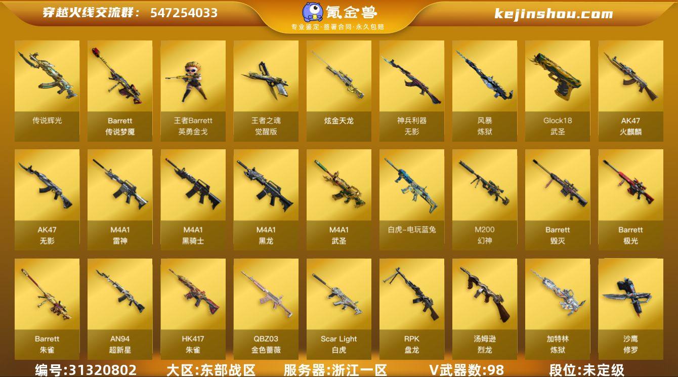 浙江一区-101V-10王者-1炫金 【传说武器】:传说辉光,传说梦魇 【热门武器】:传说梦魇,传说辉光,QBZ03-金色蔷薇,M14EBR-玄武,Scar Light-白虎*3,HK417-朱雀,M4A1-青龙,M200-幻神,M200-竞技荣光,荣耀世冠-火麒麟,白虎-电玩蓝兔,柯尔特-冠军之特*3,荣耀世冠-柯尔特*2,炼狱-迷你小钢,M4A1-黑骑士*5,汤姆逊-烈龙*6,RPK-盘龙*4,加特林-炼狱,金色蔷薇-空,斯泰尔-蝴蝶,裁决-雪莉杨,沙鹰-修罗,Knife-冠军之刃,荣耀世冠-龙啸 【王者炫金武器】:炫金天龙 【音效卡】:M200-幻神音效卡,M4A1-黑骑士音效卡,Scar Light-白虎音效卡 【皮肤】:Scar Light-白虎-暗星,QBZ03-冠军之薇,雷神-荣耀之魄,雷神-冠军之魄,雷神-杨戬,雷神-机甲刑天皮肤,雷神-脉冲核心,雷神-宇航兔皮肤,火麒麟-雷神,火麒麟-百城,火麒麟-巅峰荣耀,火麒麟-心动糖果,毁灭-CFS2020,毁灭-风暴,毁灭-魔灵皮肤,毁灭-英雄计划 皮肤,黑龙-暗月,黑龙-墨子皮肤,黑骑士-暗月,黑骑士-冠军之势,黑骑士-地狱火,无影-能量核心,战神-粉色甜心皮肤,AK47-B-常胜将军-曹操,AK47-B-常胜将军-刘备,炼狱-玩具枪皮肤,修罗-星空,修罗-冠军之魂,天神-宇航兔皮肤,屠龙-荣耀之锋*2,屠龙-荣耀世冠AG,龙啸-冠军之啸,擎天-冠军之击 【角色】:雨棠,电竞教官-云悠悠,鹰,王者葵-惊若翩鸿,修道士,初恋灵狐,芳心审判者,虎妞,灵狐者-七夕宝贝,龙儿-小淘气,麻雀,曼陀罗-礼服,潘多拉-甜心教官,斯沃特-X,蜀雪,兔囡囡,新灵狐者,樱-战斗天使 【人偶武器】:裁决-雪莉杨,天龙-曼陀罗,火麒麟-灵狐,王者Barrett-英勇金戈,M4A1-雷神-精英刀锋*2,炼狱-迷你小钢,金色蔷薇-空,斯泰尔-蝴蝶,黄金迷你深渊冰龙,迷你深渊冰龙,迷你裂空之翼,黄金迷你裂空之翼,迷你波特博士,夺魂,迷你火种,生化手雷-机甲核心*2,Barre...