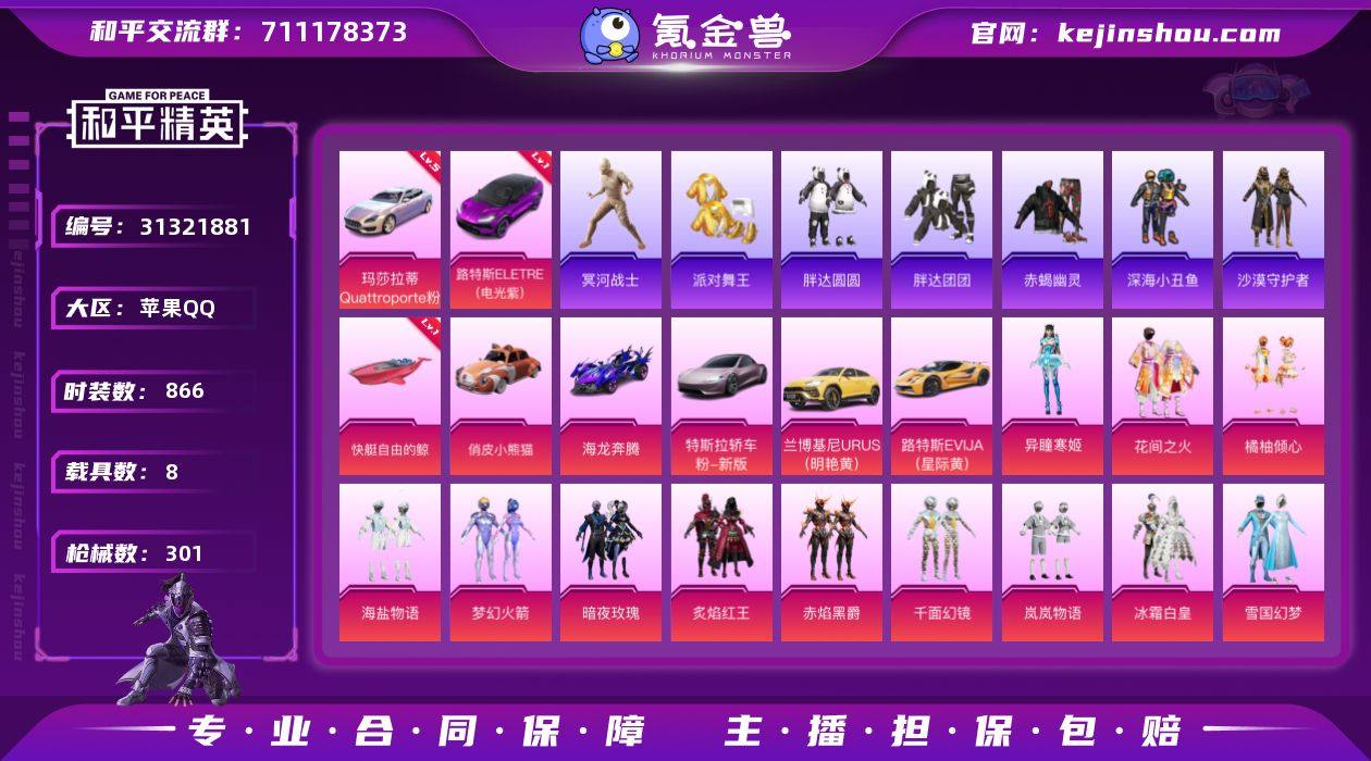 热力值:135949 载具数:8 时装数:866 枪械数:301 战备数:210 游戏等级:72 卓越印记:5 传奇印记:0 绝世印记:0 五级玛莎拉蒂Quattroporte(幻星粉),一级路特斯ELETRE(电光紫) 异瞳寒姬,暗夜玫瑰,宝贝奶油派,冰川粉黛,冰川红玫,冰川幽秘,缤纷油彩,百合蜜语,冰霜白皇,彩虹鹿灵,彩虹甜喵,赤焰黑爵,炙焰红王,炙焰牛王,第五大道,独舞天鹅,复仇流浪者,放客神游,粉色回忆,寒光使者,花间之火,海盐物语,橘柚倾心,极致幻想,恐龙拽拽,零号机款机体服,岚岚物语,梦幻火箭,蜜桃特工,暖熊萌萌,千面幻镜,山涧鹿灵,天使彩虹糖,闪耀律动,太空嘟嘟,甜蜜誓约,童趣迷兔,甜心巧克力,馨动时刻,雪国幻梦,绚丽摇曳,旋转彩虹,银刃赛罗,紫电风暴 七级M762-甜蜜誓约,六级AKM-甜心宝贝,六级UMP45-雪国精灵,五级DP-28-豹影疾电,五级GROZA-旋转彩虹,五级Kar98K-巳巳如意,五级M416-暖熊萌萌,五级平底锅-林间仙鹿,五级SCAR-L-童趣迷兔,四级M762-甜心娃娃,四级UZI-筑梦精灵,二级AKM-百合蜜语,二级M16A4-垂柳戏鸭,二级M416-心之恋语,一级AWM-橘柚倾心 一级快艇-自由的鲸,海龙奔腾,兰博基尼URUS(明艳黄),路特斯EVIJA(星际黄),俏皮小熊猫,特斯拉Roadster(沁心粉) 僚机-萌兔起飞,极意拳锋飞行器,炫彩糖果降落伞,炫彩糖果飞行器,异瞳寒姬降落伞,阿狸红飞行器,冰川粉黛飞行器,幻星舰长飞行器,梦幻火箭飞行器,暖熊萌萌飞行器,千面幻镜飞行器,绮梦青鸾飞行器,圣光天使飞行器,太空嘟嘟飞行器,相思残雪飞行器,暗星紫秘降落伞,暗夜玫瑰降落伞,百合蜜语降落伞,碧影闪光降落伞,彩虹甜喵降落伞,垂柳戏鸭降落伞,春暖花开降落伞,第五大道降落伞,繁花小夜曲降落伞,伏魔团降落伞,粉色回忆降落伞,镜光幻境降落伞,机甲封神降落伞,橘柚倾心降落伞,恐龙拽拽降落伞,林间仙鹿降落伞,梦幻火箭降落伞,马卡龙降落伞,妙趣可丽降落伞,暖熊萌萌降落伞,绒雪飘舞降落伞,飒粉甜心降落伞,四圣焕新降落伞,太空嘟嘟降落伞,甜蜜草莓降落伞,甜蜜誓约降落伞,童趣迷兔降落伞,甜心宝贝降落伞,天星战神降落伞,夏日绵绵冰降落伞,相思残雪降落伞,旋转彩虹降落伞,心之恋语降落伞,筑梦精灵降落伞 SS37特训,青翼流星,雪国风尚,SS36特训,冥河战士,炫彩糖果,萌鸡速递,SS35特训,元气之梦,懒羊羊,狂鲨锋刃,SS34特训套装,安第斯皇冠,艾克斯奥特曼,Alan Walker,暗影哥特,暗夜傀儡,暗夜契约,冰川特警,缤纷果语,缤纷假日,暴风机械师,滨海假日,白色伏地魔,白熊同盟,纯白誓言,春光漫游,初火先锋,长空猛禽,春日漫步,赤蝎幽灵,初雨海棠,蝶变,大橘大利,呆萌铁蟹,淡雅花蕊,飞驰魅影,风玲,绯格组合,飞狐塔尔斯,粉红小猪,疯狂小兔子,风铃甜诗,粉团憨憨,福星高照,飞行日记,龟仙人,光之冒险,幻彩翩翩,海岛探路者,鹤鸣,虎虎生威吉莉,荷畔雨呱,黑色刀锋,黑色伏地魔,灰色格斗者,黄色运动,幻世战舞者,和煦暖阳,辉星之火,金环蜂王,晶辉守护,娇憨猪猪,击剑大师,竞技名士,吉莉礼服,激萌罗小黑,极速竞梦,街头潮人,机械征服者,军械专家,酷潮明星,科技之星,快闪甜心,狂沙舞者,空投萌叽,灵动马戏师,灵幻魔术师,玲珑飞花,黎明保卫者,猎梦纪元,灵蜜圈圈,浪漫天命,镭射皇者,莱茵河畔,恋语绒绒,冷焰舞者,妙红点点,梦幻奶油,萌黄之夏,魅力单车,麻辣教官,茉莉之诺,懵萌河马,萌趣咩咩,萌趣颜团子,明日香款战斗服,萌熊伴侣,弄