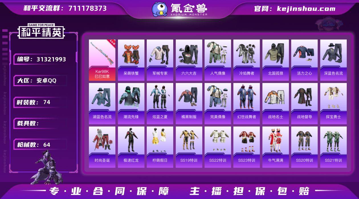 HT342(送暗区)【极品皇冠20年老号Q70级1特效枪】可二次 安Q吃鸡-74套装 64枪皮(可二次)18350热力值 4印记 历史超级王牌4星【1特效枪】Kar98K-巳巳如意(4级)【5热门】雪山精英 呆萌铁蟹 破蛋小黄鸡 极速红龙 暗夜傀儡 龟仙人 缤纷果语 炫蓝之夏 萌趣颜团子 SS12特训 海上生明月 时尚圣诞 M167A4-快乐主宰 M24-仲夏莫吉托 临安公主头盔 星穹咏叹调降落伞 【暗区】仓库价值8.8M 科恩币33825K 3套装-金狮护身.转运套装 鎏金街头套装 公司成员套装 段位-专家Ⅲ 枪皮-火力倾泻.AKM 竞技.MDR 炎夏浪花.AR57