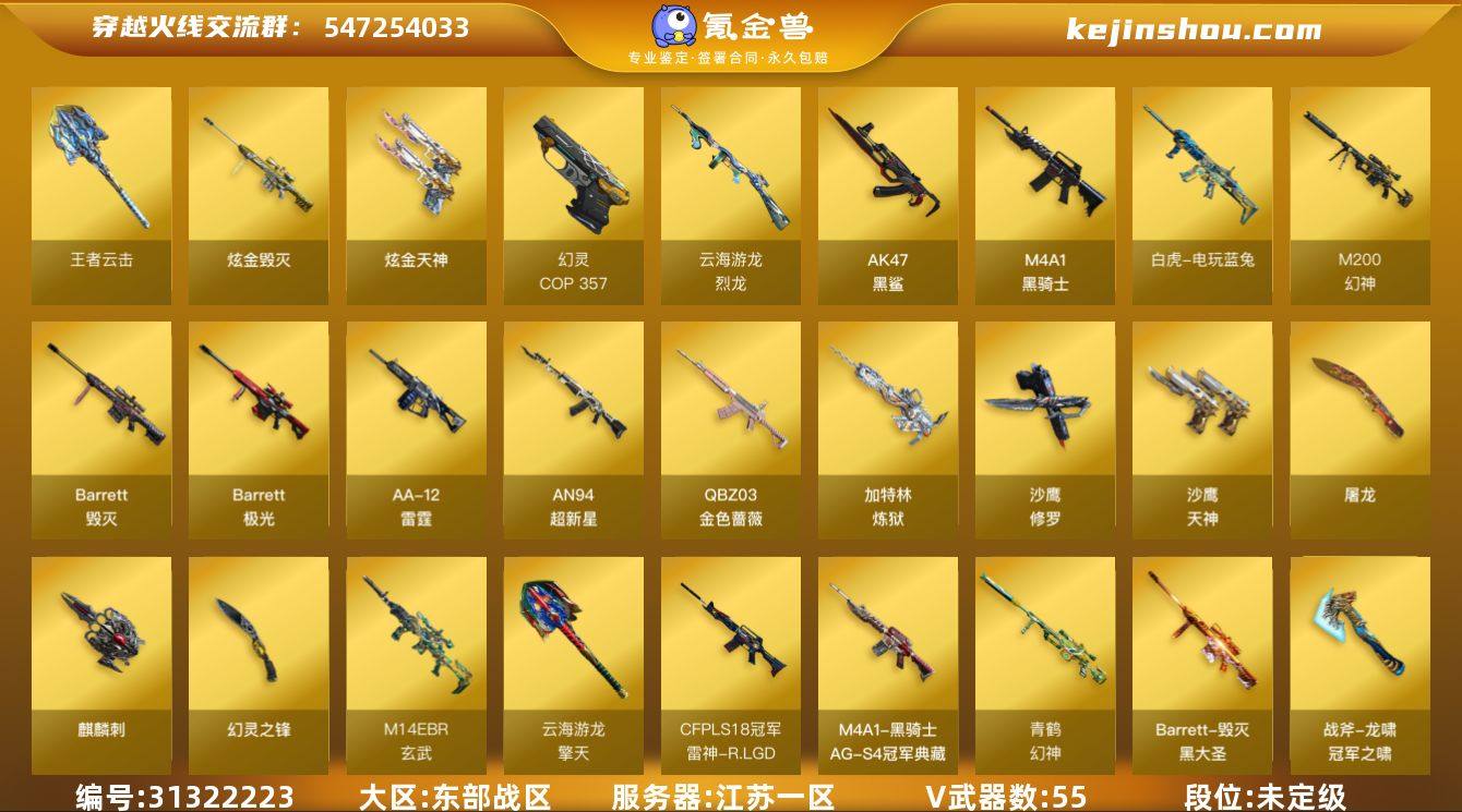 江苏一区-58V-6王者-2炫金 【热门武器】:QBZ03-金色蔷薇,M14EBR-玄武,M4A1-青龙*2,M200-幻神,白虎-电玩蓝兔,Kar98K-星神,M4A1-黑骑士*6,加特林-炼狱,5-炽火炎龙,毁灭-孙三炮,COP 357-幻灵,沙鹰-修罗 【王者炫金武器】:王者云击,炫金毁灭,炫金天神 【皮肤】:幻神-冠军之幻,幻神-青鹤,幻神-电流骇客 皮肤,幻神-电竞之星 皮肤,QBZ03-巅峰荣耀皮肤,裁决-流光秘银,雷神-R.LGD-CFPLS18冠军,雷神-炽焰魔龙,M4A1-雷神-巅峰荣耀皮肤,火麒麟-百城,毁灭-黑大圣皮肤,黑骑士-AG-S4冠军典藏,黑骑士-少林,黑骑士-破浪10年皮肤,龙啸-冠军之啸 【角色】:鹰,隼,王者-瞳-闭月羞花,王者潘多拉,云海玲珑,初恋灵狐,电竞少女,飞虎队-X,荆棘玫瑰,娟娟,灵动武士,灵狐者-职业经理,曼陀罗-X,潘多拉-甜心教官,甜心偶像,维纳斯 【人偶武器】:毁灭-孙三炮,白虎-迷你小艾,5-炽火炎龙,斯泰尔-枪娘暗刃,迷你裂空之翼*2,迷你波特博士*2,夺魂*2,迷你火种*2,迷你深渊冰龙-王绿豆 【暴走生化】:黑龙吞噬者 【挑战大师】:激光毁灭者III-白马银枪,试炼破坏者III,神圣爆裂者-末日III 【英雄级武器】:M4A1-黑骑士*6,AN94-超新星,AK47-黑鲨*2,M4A1-青龙*2,M14EBR-玄武,QBZ03-金色蔷薇,王者白虎-觉醒版,QBZ-03-王者蔷薇-觉醒版,王者龙血-觉醒版,白虎-电玩蓝兔,Barrett-毁灭,Barrett-极光*3,M200-幻神,Kar98K-星神,王者风神-觉醒版,加特林-炼狱,炼狱-悦蓝-觉醒版,烈龙-云海游龙,AA-12-雷霆,沙鹰-修罗,沙鹰-天神*3,COP 357-幻灵,屠龙,麒麟刺*4,幻灵之锋*2,擎天-云海游龙,高爆手雷-幻灵*2,高爆手雷-云龙*2,手雷-云海游龙,闪光弹-幻灵*2,闪光弹-云龙*3,烟雾弹-幻灵*3,烟雾弹-云龙*3 【道具】:云海游龙炫彩背包,次元之矛-黄金背包,绿色巨人,灵魂忍者,迷雾幽灵,...