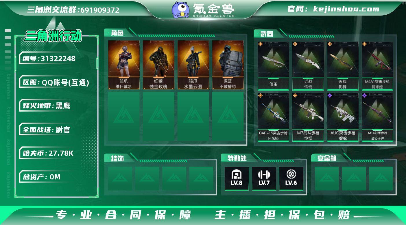 总资产210.1M,哈夫币 27782.1K,战场等级:36 尉官,行动等级:60 黑鹰,角色皮肤6,枪皮数量71 【特战干员外观】红狼-蚀金玫瑰,骇爪-水墨云图,骇爪-维什戴尔,红狼-电锯惊魂,露娜-金牌射手,深蓝-不破誓约, 【近战】近战-影锋,近战-怜悯,近战-信条,近战-黑鹰, 【典藏外观】PKM通用机枪-精湛工艺,M14射手步枪-蛇纹涂装,SKS射手步枪-蝴蝶, 【步枪】G3战斗步枪-骑士,SG552突击步枪-运动员,M7战斗步枪-怜悯,CAR-15突击步枪-阿米娅,M4A1突击步枪-阿米娅,SCAR-H战斗步枪-水墨云图,M4A1突击步枪-蚀金玫瑰,ASh-12战斗步枪-鹅鸭杀,SCAR-H战斗步枪-启航,腾龙突击步枪-死神玫瑰,KC17突击步枪-电锯惊魂,AK-12突击步枪-纵横,AUG突击步枪-零重力,SCAR-H战斗步枪-囚徒,QBZ95-1突击步枪-曙光,AUG突击步枪-蝮蛇,K437突击步枪-守护者,腾龙突击步枪-聚光灯,SCAR-H战斗步枪-荣耀列队,M7战斗步枪-前沿科技,腾龙突击步枪-前沿科技,M4A1突击步枪-海色,QBZ95-1突击步枪-海色,PTR-32突击步枪-黄蜂,腾龙突击步枪-三角洲力量,SG552突击步枪-海浪,QBZ95-1突击步枪-海浪,SCAR-H战斗步枪-数码迷彩,M4A1突击步枪-粉色涂装,M7战斗步枪-红色涂装,AUG突击步枪-浅蓝涂装,SG552突击步枪-浅蓝涂装,K416突击步枪-几何迷彩,K416突击步枪-高雅黑,M4A1突击步枪-高雅黑,QBZ95-1突击步枪-高雅黑,G3战斗步枪-高雅黑, 【狙击步枪/射手步枪】SKS射手步枪-骑士,R93狙击步枪-维什戴尔,SR-25射手步枪-信条,SV-98狙击步枪-囚徒,M700狙击步枪-蝮蛇,M14射手步枪-甜心子弹,AWM狙击步枪-无极限,SR-25射手步枪-开拓,PSG-1射手步枪-前沿科技,SKS射手步枪-弄臣,Mini-14射手步枪-荣耀列队,SV-98狙击步枪-哈夫克航天,SR-25射手步枪-黄蜂,SV-98狙击步枪-红色涂装, 【冲锋枪】QCQ171冲锋枪-鹅鸭杀,P90冲锋枪-信...