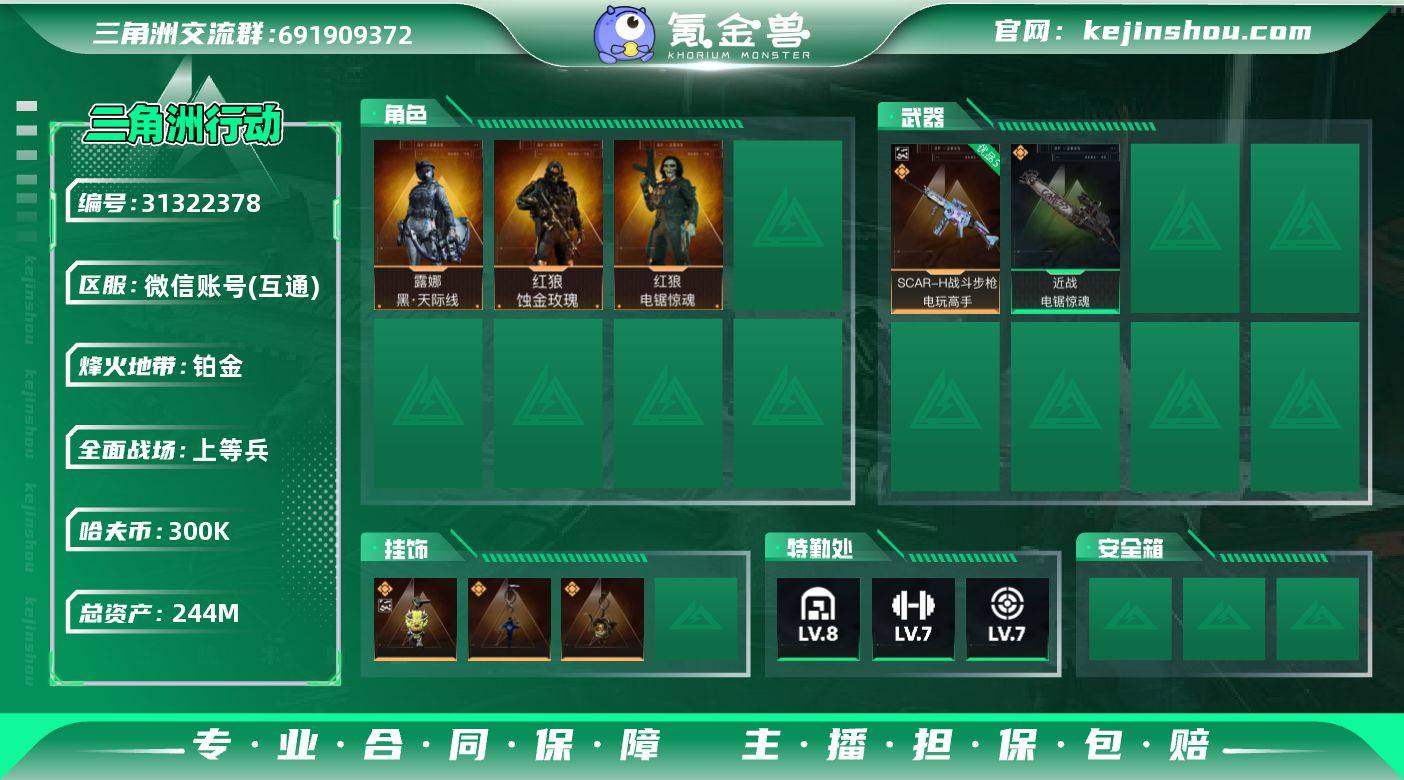 实名:不可二次实名 总资产:244M 哈夫币:300K 烽火地带段位:铂金 烽火地带等级:60 全面战场段位:上等兵 全面战场等级:26 8级仓库,7级训练中心,7级靶场,2级潜水中心,1级收藏室 战术部门等级:3 战斗部门等级:3 医疗部门等级:3 研发部门等级:3 后勤部门等级:3 曼德尔砖-电玩高手:2 曼德尔砖-美杜莎:1