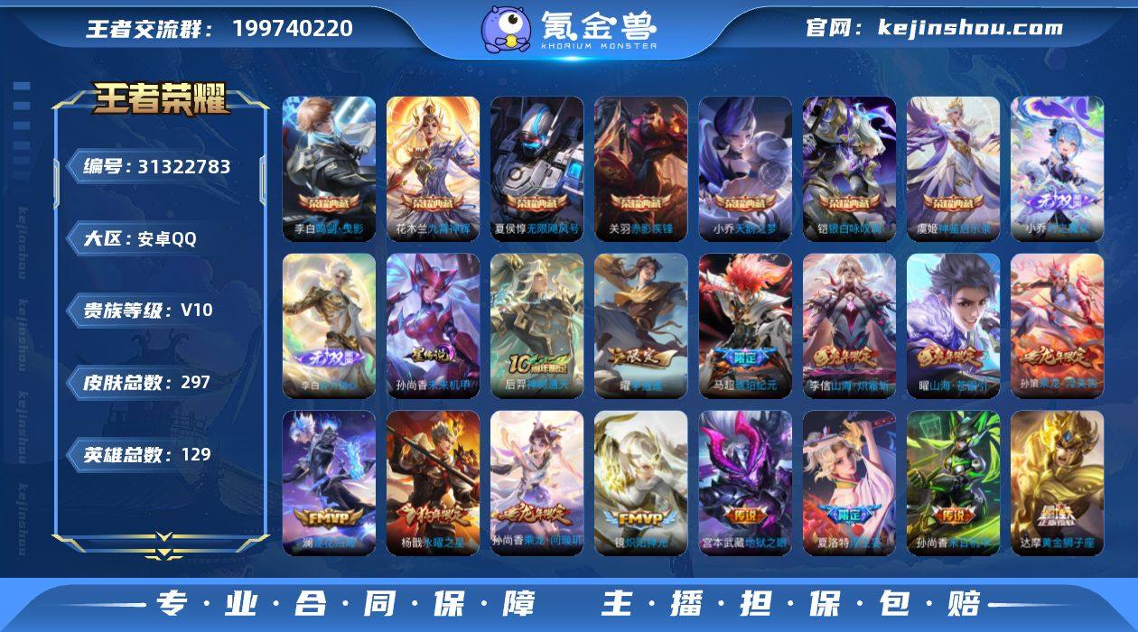 贵族等级:V10 典藏皮肤数:7 珍品无双皮肤数:0 无双皮肤数:2 珍品传说皮肤数:0 传说皮肤数:41 史诗皮肤数:75 皮肤数:297 英雄数:129 段位:非凡王者 卖家说:万战李白 九千分宫本 赛季历史有巅峰一点千八 七个荣耀典藏两无双 还有一些传说有一套年限还有琥珀纪元是全的