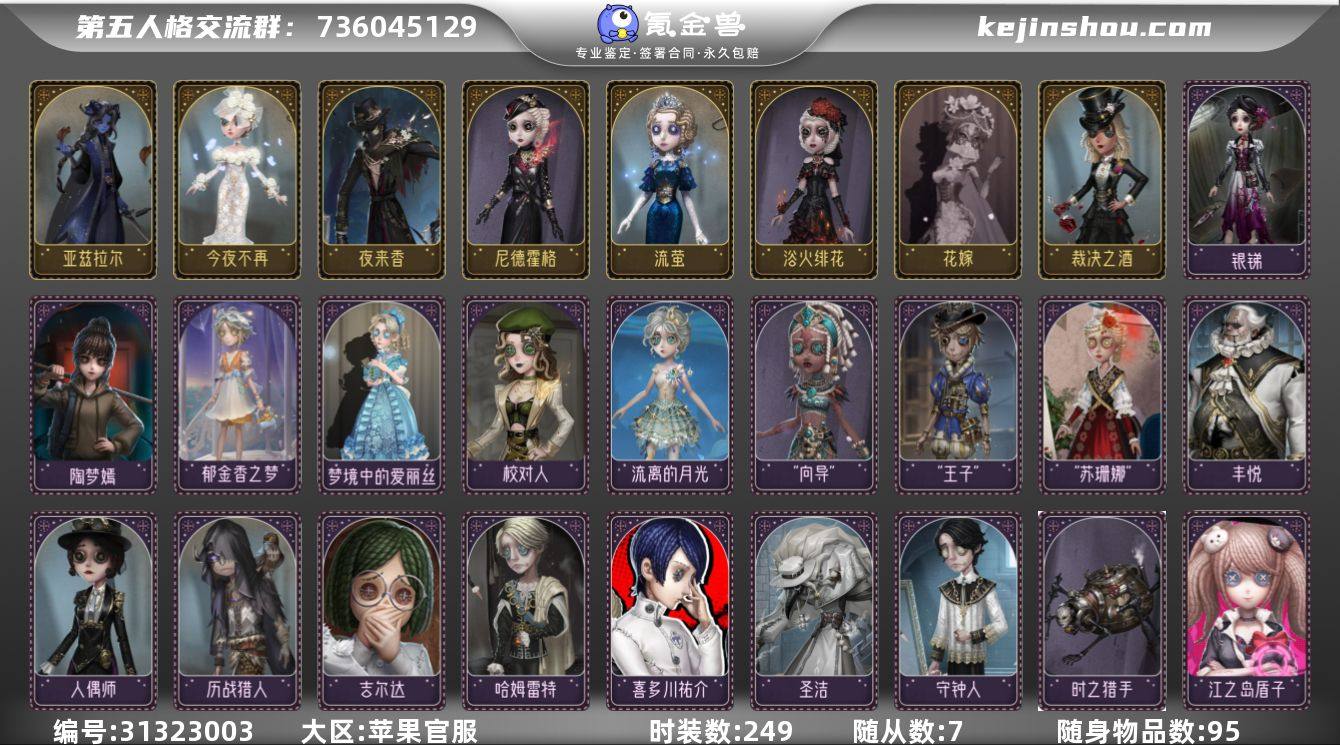 账号类型: 邮箱账号 时装数: 249 时装: 26号守卫-西部大亨,红蝶-花嫁,红蝶-祈雨之女,黄衣之主-波塞冬,画家-江户川乱步,“杰克”-白纹大触,“杰克”-夜来香,机械师-人偶师,祭司-神圣之辉,空军-琼楼遗恨,空军-尼德霍格,空军-“苏珊娜”,盲女-甜心蛋糕,盲女-吉尔达,孽蜥-窃梦行者,入殓师-喜多川祐介,入殓师-哈姆雷特,入殓师-守钟人,摄影师-亚兹拉尔,调香师-今夜不再,调酒师-裁决之酒,调酒师-江之岛盾子,先知-历战猎人,医生-浴火绯花,野人-雪原猎人,邮差-“王子",蜘蛛-时之猎手,咒术师-“向导”,厂长-丰悦,“噩梦”-圣洁,爱哭鬼-爱德华·梅森,医生-流萤,舞女-流离的月光,调酒师-校对人,记者-梦境中的爱丽丝,园丁-郁金香之梦,古董商-陶梦嫣,医生-银锑 ,园丁-源自星辰