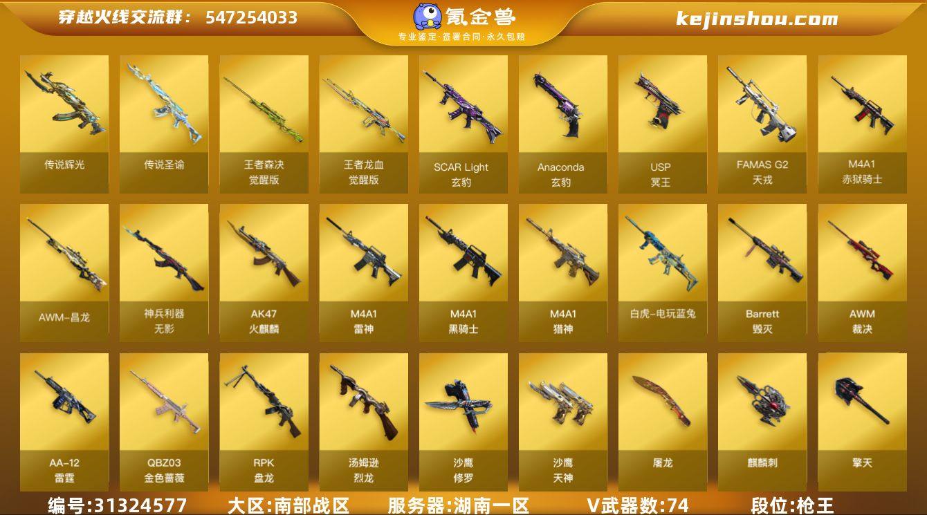 湖南一区-77V-8王者-0炫金 【传说武器】:传说辉光,传说圣谕 【传说角色】:传说星骇 【热门武器】:传说辉光,传说圣谕,QBZ03-金色蔷薇,M200-竞技荣光,荣耀世冠-火麒麟,荣耀世冠-雷神,白虎-电玩蓝兔,金色小号,M4A1-黑骑士,汤姆逊-烈龙*6,RPK-盘龙*6,沙鹰-修罗*5,荣耀世冠-龙啸 【王者炫金武器】:王者凌虎 【音效卡】:M4A1-黑骑士音效卡,AWM-裁决音效卡,AWM-昌龙-怀旧音效卡 【皮肤】:幻神-AG-CFPL S24冠军 皮肤,白虎-白鲨-CFPLS23冠军,QBZ03-AG-CFPLS19冠军,QBZ03-金色蔷薇-拼搏,裁决-巅峰荣耀 皮肤,Kar98K-星神-冠军之星皮肤,雷神-星空,M4A1-雷神-拼搏,火麒麟-雷神,火麒麟-平天大圣*2,火麒麟-心动糖果,毁灭-暗月,毁灭-冠军之怒,黑龙-能量核心,黑骑士-电玩青兔皮肤,战神-粉色甜心皮肤*4,战神-流金岁月皮肤,AK47-B-常胜将军-刘备,AK47-B-常胜将军-孙权,极光-能量核心,炼狱-奇幻宇宙万象,龙啸-巅峰荣耀 皮肤 【角色】:玄豹,荆棘,战地猎狐,王者涂鸦,奇洋探员,乔伊教练,修道士,云海玲珑,暗夜-X,初恋灵狐,嘉年华灵狐,娟娟,灵动武士,灵狐者-黄金海岸,灵狐者-七夕宝贝,曼陀罗-礼服,女战神,蛇姬,斯沃特-X,铁骑荣耀,樱-战斗天使 【人偶武器】:天龙-曼陀罗,异变清道夫-蛇影双骄,萌兔-斯泰尔,AWM-灵狐-15周年嘉年华,迷你生化手雷,生化手雷-机甲核心,M200-夜玫瑰,迷你超能女侍 【暴走生化】:超级对讲机 【挑战大师】:冰龙粉碎者-白马银枪 【英雄级武器】:AK47-火麒麟*2,M4A1-雷神,M4A1-黑骑士,QBZ03-天罚,无影-神兵利器,FAMAS G2-天戎,SCAR Light-玄豹,QBZ03-金色蔷薇,M4A1-猎神,AK-47-猩红传说,王者龙血-觉醒版,白虎-电玩蓝兔,王者玄武-觉醒版,荣耀世冠-火麒麟,荣耀世冠-雷神,Barrett-毁灭,AWM-裁决,M200-竞技荣光,王者森决-觉醒...