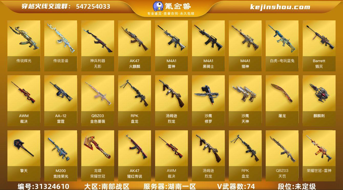 湖南一区-77V-8王者-0炫金 【传说武器】:传说辉光,传说圣谕 【传说角色】:传说星骇 【热门武器】:传说辉光,传说圣谕,QBZ03-金色蔷薇,M200-竞技荣光,荣耀世冠-火麒麟,荣耀世冠-雷神,白虎-电玩蓝兔,金色小号,M4A1-黑骑士,汤姆逊-烈龙*6,RPK-盘龙*6,沙鹰-修罗*5,荣耀世冠-龙啸 【王者炫金武器】:王者凌虎 【音效卡】:M4A1-黑骑士音效卡,AWM-裁决音效卡,AWM-昌龙-怀旧音效卡 【皮肤】:幻神-AG-CFPL S24冠军 皮肤,白虎-白鲨-CFPLS23冠军,QBZ03-AG-CFPLS19冠军,QBZ03-金色蔷薇-拼搏,裁决-巅峰荣耀 皮肤,Kar98K-星神-冠军之星皮肤,雷神-星空,M4A1-雷神-拼搏,火麒麟-雷神,火麒麟-平天大圣*2,火麒麟-心动糖果,毁灭-暗月,毁灭-冠军之怒,黑龙-能量核心,黑骑士-电玩青兔皮肤,战神-粉色甜心皮肤*4,战神-流金岁月皮肤,AK47-B-常胜将军-刘备,AK47-B-常胜将军-孙权,极光-能量核心,炼狱-奇幻宇宙万象,龙啸-巅峰荣耀 皮肤 【角色】:玄豹,荆棘,战地猎狐,王者涂鸦,奇洋探员,乔伊教练,修道士,云海玲珑,暗夜-X,初恋灵狐,嘉年华灵狐,娟娟,灵动武士,灵狐者-黄金海岸,灵狐者-七夕宝贝,曼陀罗-礼服,女战神,蛇姬,斯沃特-X,铁骑荣耀,樱-战斗天使 【人偶武器】:天龙-曼陀罗,异变清道夫-蛇影双骄,萌兔-斯泰尔,AWM-灵狐-15周年嘉年华,迷你生化手雷,生化手雷-机甲核心,M200-夜玫瑰,迷你超能女侍 【暴走生化】:超级对讲机 【挑战大师】:冰龙粉碎者-白马银枪 【英雄级武器】:AK47-火麒麟*2,M4A1-雷神,M4A1-黑骑士,QBZ03-天罚,无影-神兵利器,FAMAS G2-天戎,SCAR Light-玄豹,QBZ03-金色蔷薇,M4A1-猎神,AK-47-猩红传说,王者龙血-觉醒版,白虎-电玩蓝兔,王者玄武-觉醒版,荣耀世冠-火麒麟,荣耀世冠-雷神,Barrett-毁灭,AWM-裁决,M200-竞技荣光,王者森决-觉醒...