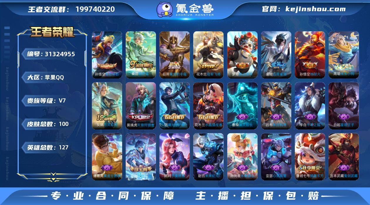 苹果Q-V7-至尊星耀II段位-127英雄-100皮肤-1典藏皮肤-7传说-27史诗Lk262710 【荣耀典藏】:孙悟空全息碎影 【传说皮肤】:后羿神树通天,桑启鸣野蒿,虞姬云霓雀翎,花木兰冠军飞将,梦奇胖达荣荣,后羿黄金射手座,孙悟空地狱火 【限定皮肤】:狄仁杰阴阳师,赵云皇家上将,鲁班七号狮舞东方,夏侯惇朔风刀,狄仁杰魔术师,狄仁杰万华元夜,项羽海滩派对,老夫子醍醐杖,程咬金演武夺筹,钟馗神迹守卫,钟馗驱傩正仪,鬼谷子原初探秘者,弈星混沌棋,明世隐疑决卦,裴擒虎天狼狩猎者,盾山御銮 【赛季限定】:盾山御銮,夏侯惇朔风刀,弈星混沌棋,明世隐疑决卦,老夫子醍醐杖,鬼谷子原初探秘者,狄仁杰万华元夜,程咬金演武夺筹,钟馗驱傩正仪,东皇太一噬灭天穹,钟馗虚灵犬护,甄姬逆浪荇歌,亚瑟荣光之誓 【战令限定】:鲁班七号狮舞东方,钟馗神迹守卫,老夫子百相守梦,周瑜线条小狗 【史诗皮肤】:赵云皇家上将,赵云未来纪元,王昭君偶像歌手,狄仁杰魔术师,宫本武藏鬼剑武藏,孙尚香水果甜心,嬴政暗夜贵公子,嬴政摇滚巨星,妲己魅力维加斯,墨子金属风暴,吕布圣诞狂欢,曹操幽灵船长,李白千年之狐,吕布末日机甲,花木兰水晶猎龙者,小乔缤纷独角兽,诸葛亮黄金分割率,亚瑟心灵战警,雅典娜冰冠公主,铠曙光守护者,蔡文姬舞动绿茵,白起星夜王子,阿轲节奏热浪,裴擒虎天狼狩猎者,鲁班七号狮舞东方,弈星万物之道,女娲万灵启世,周瑜线条小狗 【其他皮肤】:项羽海滩派对,韩信教廷特使,韩信街头霸王,阿轲爱心护理,达摩大发明家,赵云白执事,赵云忍炎影,程咬金星际陆战队,白起白色死神,安琪拉玩偶对对碰,典韦黄金武士,亚瑟死亡骑士,花木兰兔女郎,甄姬花好人间,刘备万事如意,狄仁杰阴阳师,刘备汉昭烈帝,孙尚香沉稳之力,李白敏锐之力,吕布野性能量,钟馗神迹守卫,盾山御銮,...
