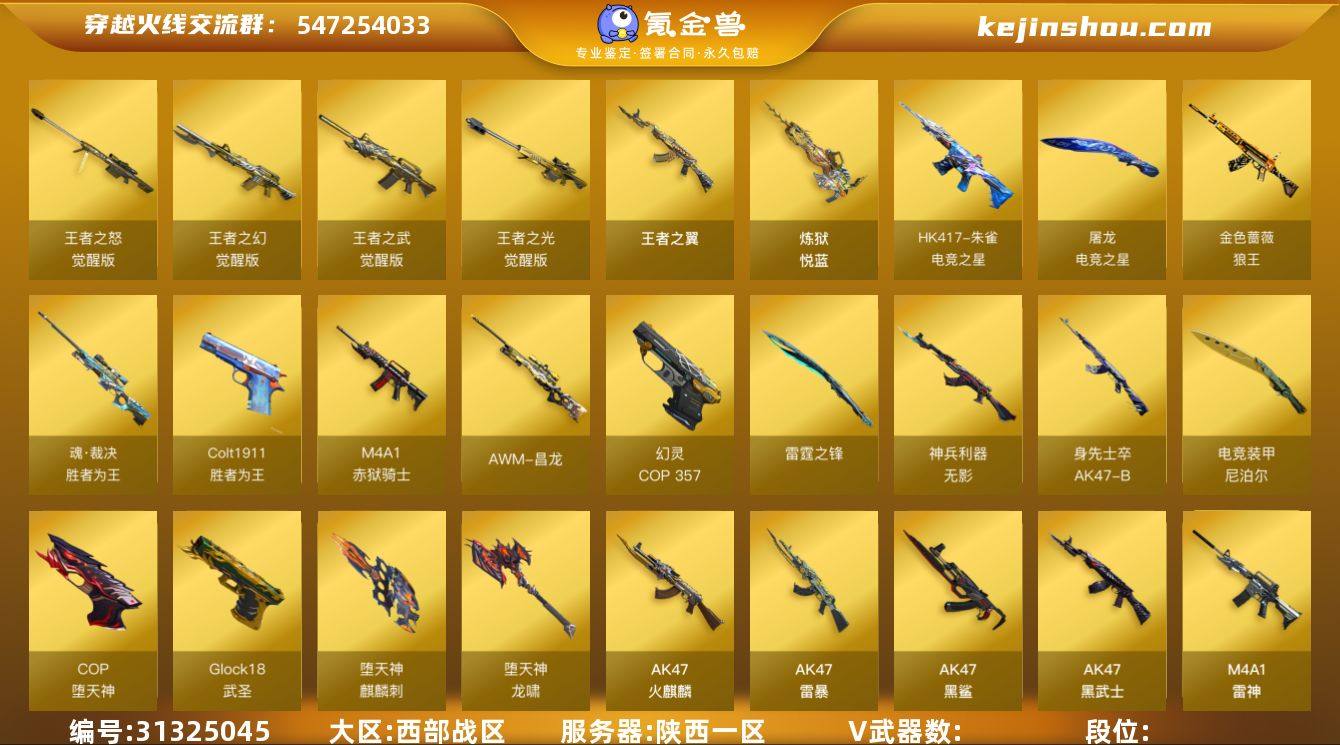 T193495(幻神+星神+4年套+6黑6白虎擎天柱+6炼6烈6盘蝴蝶)cf西部/陕西一区/215V/幻神/98K星神/雷暴套(usp*2)/幻灵套(cop*2)/堕天神套/电竞装甲套/m4夜魔+破空枪刃/6黑骑士+6白虎/6盘龙+6炼狱+6烈龙+斯泰尔蝴蝶+异变清道夫+死亡之眼/毁灭+cfpls15+音效卡/aa12擎天柱III+试炼破坏者III/沙漠玫瑰+影豹4防/多皮可排