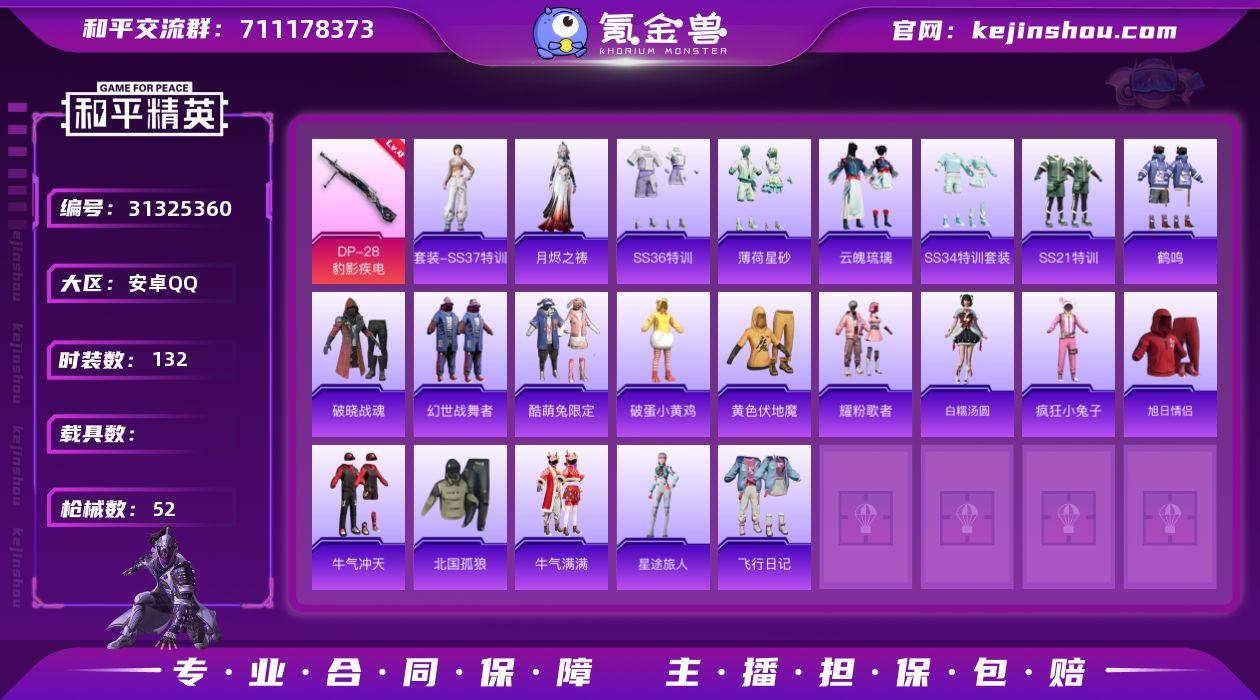 热力值:12910 时装数:132 枪械数:52 战备数:36 游戏等级:55 卓越印记:0 传奇印记:0 绝世印记:0 四级DP-28-豹影疾电 SS37特训,月烬之祷,SS36特训,薄荷星砂,云魄琉璃,SS34特训套装,北国孤狼,白糯汤圆,疯狂小兔子,飞行日记,鹤鸣,黄色伏地魔,幻世战舞者,酷萌兔限定,牛气冲天,牛气满满,破蛋小黄鸡,破晓战魂,SS21特训,旭日情侣,星途旅人,耀粉歌者 MK12-乌木金纹,AUG-紫晶流影,Mini14-鸡智如我,AC-VAL-天降萌叽,AKM-破晓战魂,AKM-夜灯,AUG-耀粉歌者,GROZA-马卡龙,GROZA-生命誓言,Kar98K-红色方程式,M16A4-红色方程式,M416-红色方程式,M416-蓝色火焰,M762-第五大道,M762-牛气冲天,MG3-幻世战舞者,蜜獾-绯穹魔姬,Mini14-马卡龙,Mini14-生命誓言,Mini14-炫彩节奏,Mk14-山经魅狐,MP5K-繁花小夜曲,平底锅-荧光虫舞,QBU-锦绣火鲤,QBZ-彩虹符号,S1897-潮汐统领,S686-生命誓言,SCAR-L-红色方程式,SCAR-L-炫彩节奏,SCAR-L-夜灯,SCAR-L-玉兔迎春,汤姆逊-耀粉歌者,UMP45-蓝色火焰,UZI-红色方程式,UZI-天降萌叽,Vector-彩虹符号,VSS-香桃花海 马上有福飞行器,顶峰精英尾迹,竞逐热浪降落伞,比翼双飞降落伞 实名:可二次实名