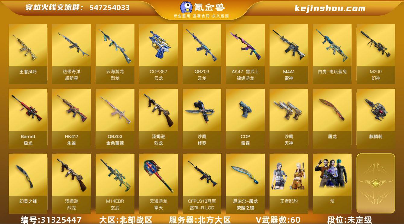 北方大区-64V-3王者-0炫金 【热门武器】:QBZ03-金色蔷薇,M14EBR-玄武,HK417-朱雀,M200-幻神,死亡之眼,白虎-电玩蓝兔,Kar98K-星神,汤姆逊-烈龙*2,5-炽火炎龙,雷神-小红,沙鹰-修罗,Knife-冠军之刃 【王者炫金武器】:王者凤吟 【音效卡】:Barrett-极光音效卡,Barrett-碧霄极光音效卡*2 【皮肤】:幻神-冠军之幻,幻神-宠儿-2021MVP,M200-幻神-N9-2022MVP,幻神-电流骇客 皮肤,金色蔷薇-纸灯龙皮肤,QBZ03-巅峰荣耀皮肤,雷神-R.LGD-CFPLS18冠军,火麒麟-大唐荣光,屠龙-荣耀之锋 【角色】:炫,鹰,战地猎狐,王者影豹,奇洋探员,云海玲珑,暗夜-X,北极狐-X,飞虎队-X,娟娟,兰-新年限定,灵狐者-X,灵狐者-职业经理,龙儿,麻雀,曼陀罗-X,萌儿,潘多拉-X,潜龙队-X,兔囡囡,维纳斯,新娜塔莎,雪莉杨,夜玫瑰-宠粉,樱-战斗天使,游珑儿 【人偶武器】:雷神-小红,5-炽火炎龙,AWM-灵狐-15周年嘉年华,迷你波特博士,夺魂,迷你牛牛,迷你生化手雷*2,生化手雷-机甲核心,深渊终结者手雷*2,灵狐娃娃手雷 【暴走生化】:死亡之眼 【挑战大师】:激光毁灭者III-白马银枪,试炼破坏者III 【英雄级武器】:M4A1-雷神,HK417-朱雀,M14EBR-玄武,QBZ03-云龙,黑武士-锦绣游龙,超新星-热带奇洋,QBZ03-金色蔷薇,王者之圣-觉醒版,白虎-电玩蓝兔,Barrett-极光,M200-幻神,Kar98K-星神,王者蔷薇-觉醒版,汤姆逊-烈龙*2,烈龙-云海游龙,沙鹰-修罗,沙鹰-天神,COP-雷霆,COP 357-云龙,屠龙,麒麟刺,幻灵之锋,擎天-云海游龙,龙啸-热带奇洋,高爆手雷-雷霆*5,高爆手雷-幻灵*2,高爆手雷-云龙*3,手雷-云海游龙,手雷-热带奇洋,闪光弹-雷霆*5,闪光弹-幻灵*2,闪光弹-云龙*3,烟雾弹-雷霆*6,烟雾弹-幻灵*2,烟雾弹-云龙*3,M4A1-赤狱骑士,Barrett-碧霄极光 【道具】:泡泡象背包