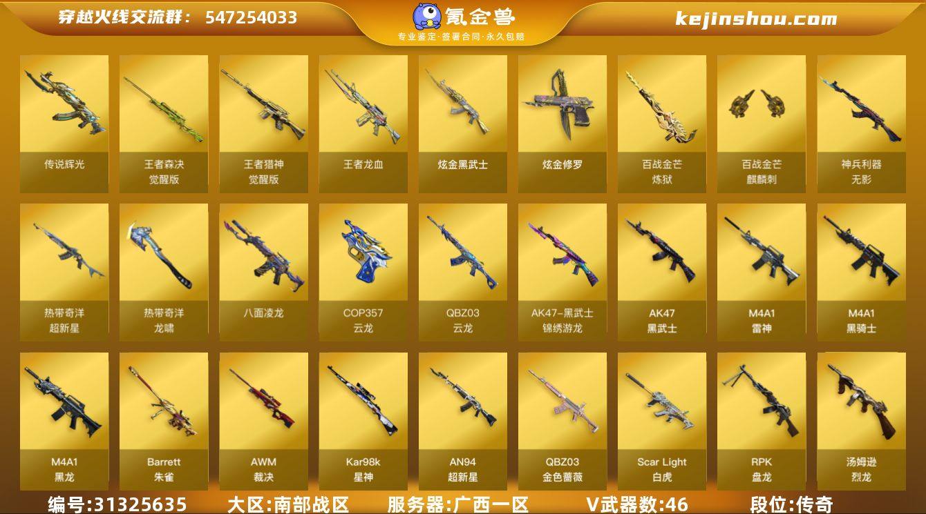 广西一区-52V-6王者-2炫金 【传说武器】:传说辉光 【传说角色】:传说星骇 【热门武器】:传说辉光,QBZ03-金色蔷薇,Scar Light-白虎,八面凌龙,死亡之眼,Kar98K-星神,炼狱-迷你小钢,M4A1-黑骑士*2,汤姆逊-烈龙*2,RPK-盘龙,加特林-炼狱,MK5-炽火炎龙,沙鹰-修罗,金刚伞 【王者炫金武器】:王者龙血,悦蓝-惊涛骇浪,炫金武士,炫金修罗 【音效卡】:M4A1-雷神音效卡,AWM-裁决音效卡,Barrett-碧霄极光音效卡,炼狱-百战金芒-庆典舞曲音效卡,火线妹语音包 【皮肤】:裁决-运输船 皮肤,星神-璀璨皮肤,星神-漫游,雷神-宇航兔皮肤,M4A1-再燃火线,毁灭-直播专属,M4A1-千变-孔明皮肤,黑骑士-破界 皮肤,炼狱-玩具枪皮肤,炼狱-月 皮肤,轻型军用手斧-再燃火线,麒麟刺-萌杀皮肤,麒麟刺-月皮肤 【角色】:樱,关小雨,晴雅,机械姬,奇洋探员,乔伊教练,修道士,飞虎队-X,风暴女,嘉年华灵狐,娟娟,灵狐者-X,龙儿,曼陀罗-礼服,萌儿,女战神,女主播,潘多拉-甜心教官,斯沃特-X,兔囡囡 【人偶武器】:白虎-迷你小艾,炼狱-迷你小钢,MK5-炽火炎龙,AWM-灵狐-15周年嘉年华*2,迷你深渊冰龙*2,迷你波特博士,夺魂,迷你生化手雷,生化手雷-机甲核心,深渊终结者手雷,迷你巨石泰坦-魔花研究所,灵狐娃娃手雷 【暴走生化】:死亡之眼,超级对讲机 【挑战大师】:火狱乱世-超越Max,机甲撕裂者III,试炼破坏者III,KAC-圣炎切割者III,阐释者III*2,惩戒者III 【英雄级武器】:M4A1-黑龙,M4A1-雷神,M4A1-黑骑士*2,AK47-黑武士,AN94-超新星,Scar Light-白虎,QBZ03-天罚,无影-神兵利器,QBZ03-云龙,黑武士-锦绣游龙,超新星-热带奇洋,八面凌龙,QBZ03-独角-IV,QBZ03-金色蔷薇,王者猎神-觉醒版,AWM-裁决,Barrett-朱雀,Kar98K-星神,王者森决-觉醒版,RPK-盘龙,加特林-炼狱,炼狱-百...