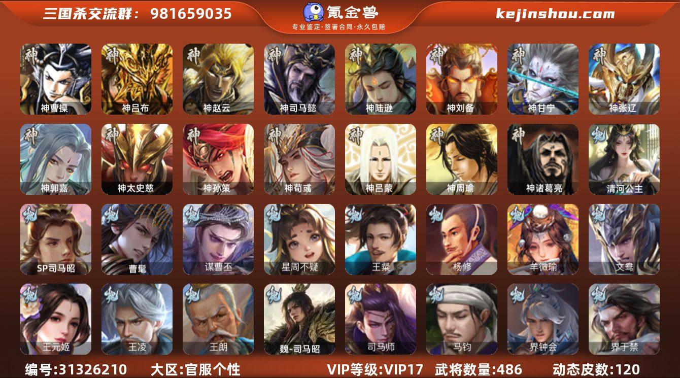 VIP等级: VIP17 官阶: 大将军 武将数量: 486 动态皮肤数量: 120 神将: 神曹操,神甘宁,神郭嘉,神刘备,神陆逊,神吕布,神司马懿,神孙策,神太史慈,神荀彧,神张辽,神赵云,神吕蒙,神周瑜,神诸葛亮 魏国武将: 刘晔,戏志才,曹纯,曹婴,陈琳,程昱,郝昭,嵇康,界曹真,界于禁,界钟会,马钧,司马师,魏-司马昭,王朗,王凌,王元姬,文鸯,羊徽瑜,杨修,王粲,唐咨-魏,张辽,SP蔡文姬,SP曹仁,SP关羽,SP贾诩,SP姜维,SP庞德,卞夫人,蔡贞姬,曹昂,曹操,曹冲,曹洪,曹丕,曹仁,曹叡,王异,张恭,鲁芝,界满宠,曹休,界曹植,满宠,荀攸,王基,钟繇,蒯越蒯良,郭嘉,牵招,荀彧,阮慧,杜畿,界郭嘉,崔琰,界曹丕,界荀彧,朱灵,界甄姬,辛毗,吕虔,界陈群,界王异,界许褚,界郭淮,华歆,陈群,界邓艾,界典韦,界曹休,袁涣,李通,乐进,辛宪英,郭淮,毛玠,界曹彰,郭皇后,毌丘俭,夏侯惇,曹植,司马朗,谋于禁,界曹操,星周不疑,许褚,界张辽,谋徐晃,张郃,钟会,文聘,曹彰,界夏侯惇,诸葛诞,司马懿,甄姬,杨阜,界徐晃,徐晃,界曹仁,孙资刘放,韩浩史涣,曹真,谋曹丕,典韦,界夏侯渊,夏侯渊,李典,于禁,王双,邓艾,界司马懿,张春华,孟达-魏,臧霸,牛金,朱灵(国战),曹髦,清河公主,SP司马昭,董昭 蜀国武将: 鲍三娘,董允,关索,花鬘,界黄忠,谯周,沙摩柯,王平,张星彩,赵襄,周群,诸葛瞻,谋马超,谋夏侯氏,蜀-谋孙尚香,马云騄,谋黄月英,徐庶,界魏延,杨仪,吕凯,界关羽,界诸葛亮,邓芝,界伊籍,胡金定,费祎,严颜,界黄月英,赵云,张松,彭羕,李丰,界刘备,谋法正,界刘禅,谋姜维,刘封,糜竺,蒋琬,谋庞统,黄月英,关羽,王甫赵累,吴懿,吴班,界廖化,向宠,祝融,张飞,黄皓,陈震,魏延,界周仓,马忠,界法正,糜夫人,界孟获,刘禅,界赵云,谋诸葛亮,界姜维,张翼,关银屏,界祝融,SP孙尚香,SP徐庶,卧龙诸葛,宗预,周仓,简雍,界关兴张苞,诸葛亮,孙乾,界张飞,界卧龙诸葛,法正,界简雍,赵统赵广,陈到,界马岱,关平,马岱,界庞统,庞统,诸葛...