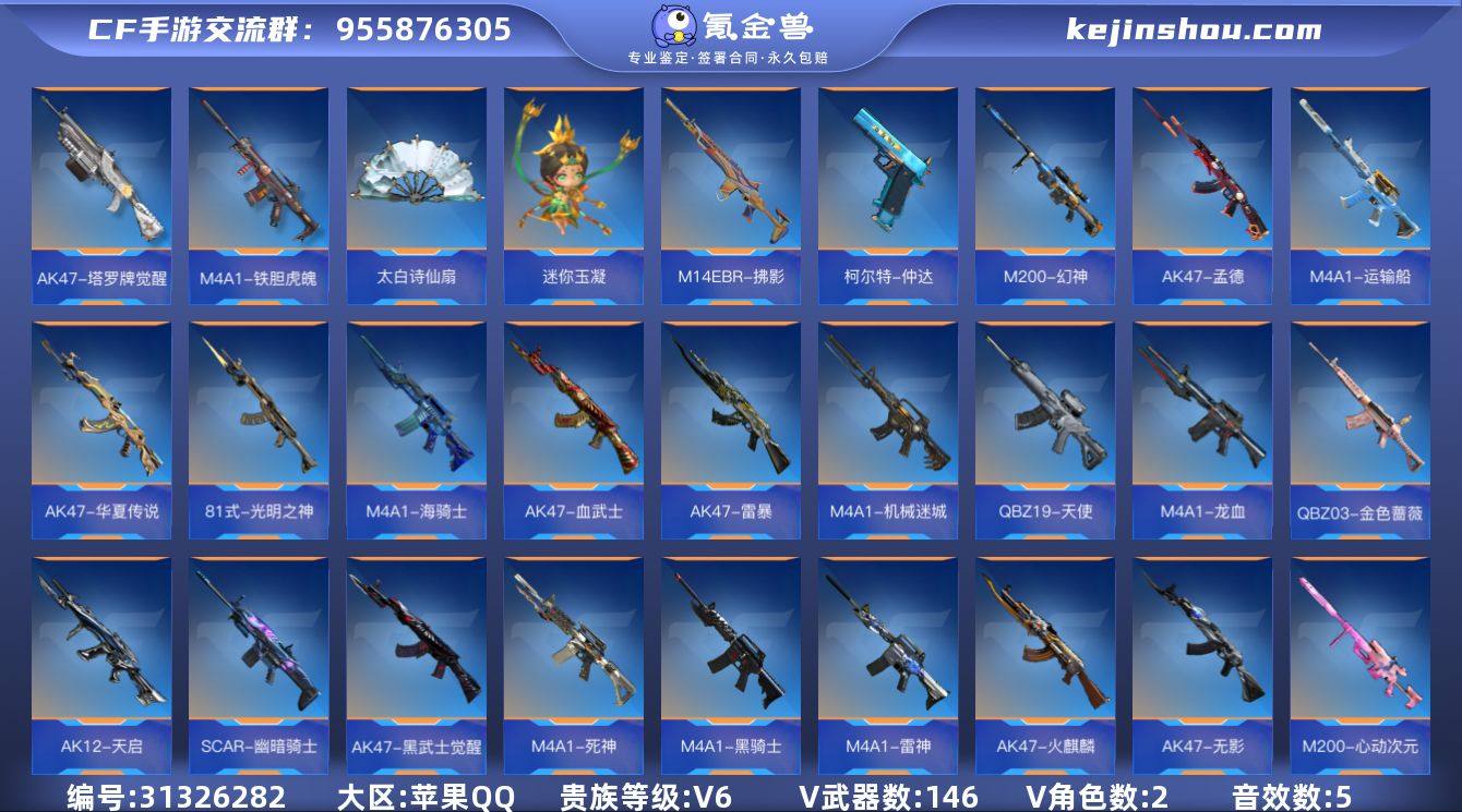 VIP6/146V/王者之影/王者之心/王者之魂/王者之霆/王者之尊/M200-权/81式-光明之神/AK47-孟德/M200-幻神/巴雷特-毁灭-现代战场/98K-星神-电音/AK47-孟德-过载之音/M4A1-仲达-过载之音/M200-权-古代战场/狙击枪线-诸神黄昏/狙击枪线-江东骇虎/审判者/葵/AK47-无影/AK47-火麒麟/AK47-黑武士觉醒/AK47-雷暴/AK47-血武士/AK47-华夏传说/AK47-木兰/AK47-塔罗牌觉醒/AK47-谜城烟火/M4A1-雷神/M4A1-黑骑士/M4A1-死神/M4A1-龙血/M4A1-机械迷城/M4A1-海骑士/M4A1-运输船/M4A1-铁胆虎魄/SCAR-幽暗骑士/M14EBR-拂影/M14EBR-葫芦山庄/AK12-天启/QBZ03-金色蔷薇/HK417-炎龙铠甲/QBZ19-天使/G36-李星云/G3A3-衍神兵/FN F2000-十绝阵觉醒/SBR-湮灭/AWM-大湾溢彩/巴雷特-毁灭/巴雷特-极光/M200-心动次元/09式狙-天神/98K-黑骑士/98K-星神/TAC-晴舞/GM6-逆骨/加特林-堡垒/加特林-星际战舰/QBB95-极光/双持斯泰尔-天使/CZS2-血月/地狱火/KSG-钟馗觉醒/USP-神罚/USP-机械迷城/沙鹰-修罗/沙鹰-宇航兔兔/改装GLOCK-木兰/GLOCK18-猎神/柯尔特-仲达/双持柯尔特-极光/掠夺者P365-虹舞/弑魔者/女皇利刃-铁胆虎魄/炽芒蝶刃/龙啸/手斧-机械迷城/屠龙/血月/太白诗仙扇/星芒/马来剑-毁灭/唐刀-大唐荣耀/擎天/迷你玉凝/末日裁决觉醒/黑武士手雷/高爆手雷-无限/粘性手雷-附骨之虫觉醒/手雷-游骑兵/高爆手雷-迷你焊魃/粘性手雷-彩虹小白马觉醒/闪光弹-游骑兵/王者之心闪光弹/闪光弹-神工天巧/闪光弹-遁天梭-飞行/闪光弹-迷你降臣/烟雾弹-游骑兵/烟雾弹-迷你侯卿/烟雾弹-幻灵/燃烧弹-游骑兵