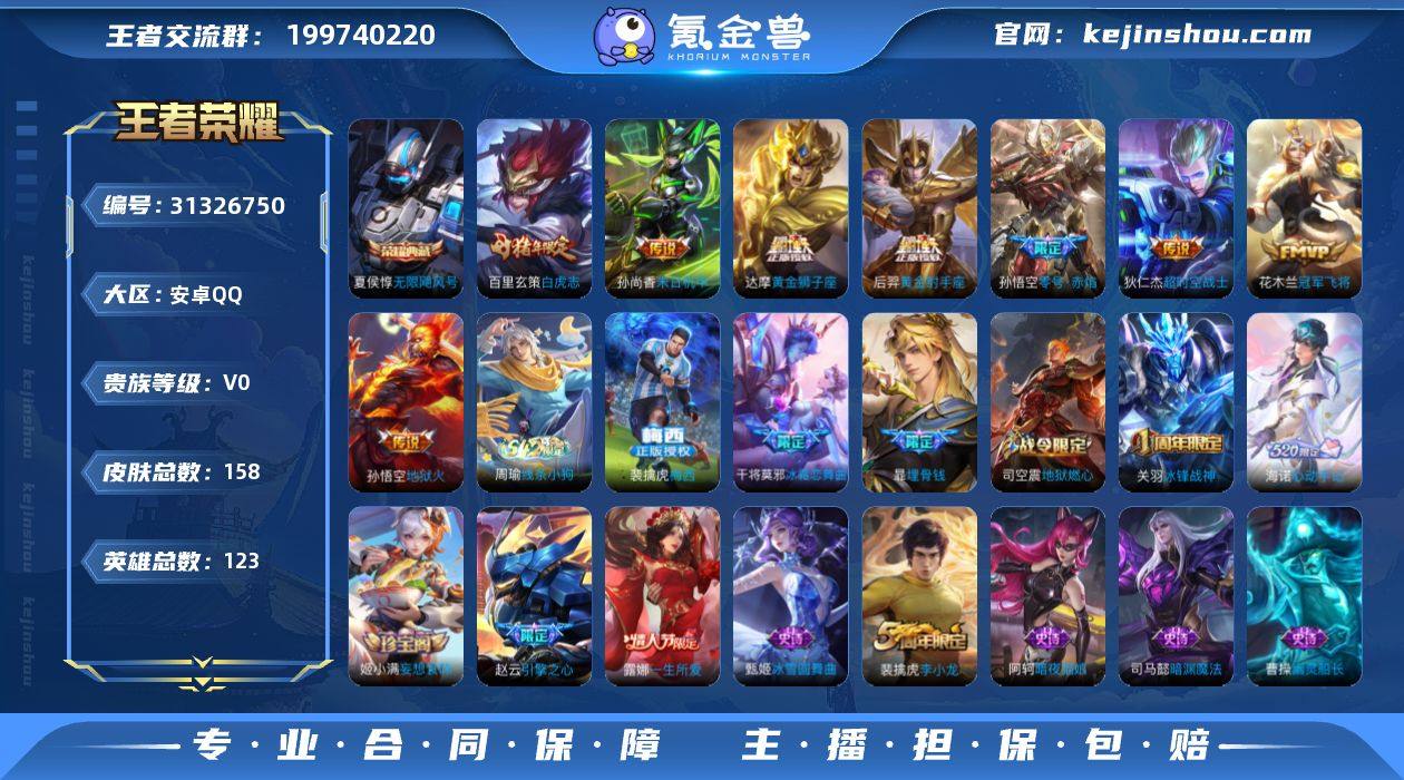 贵族等级:V0 典藏皮肤数:1 珍品无双皮肤数:0 无双皮肤数:0 珍品传说皮肤数:0 传说皮肤数:8 史诗皮肤数:51 皮肤数:158 英雄数:123 段位:钻石 卖家说:裴擒虎高胜率高评分