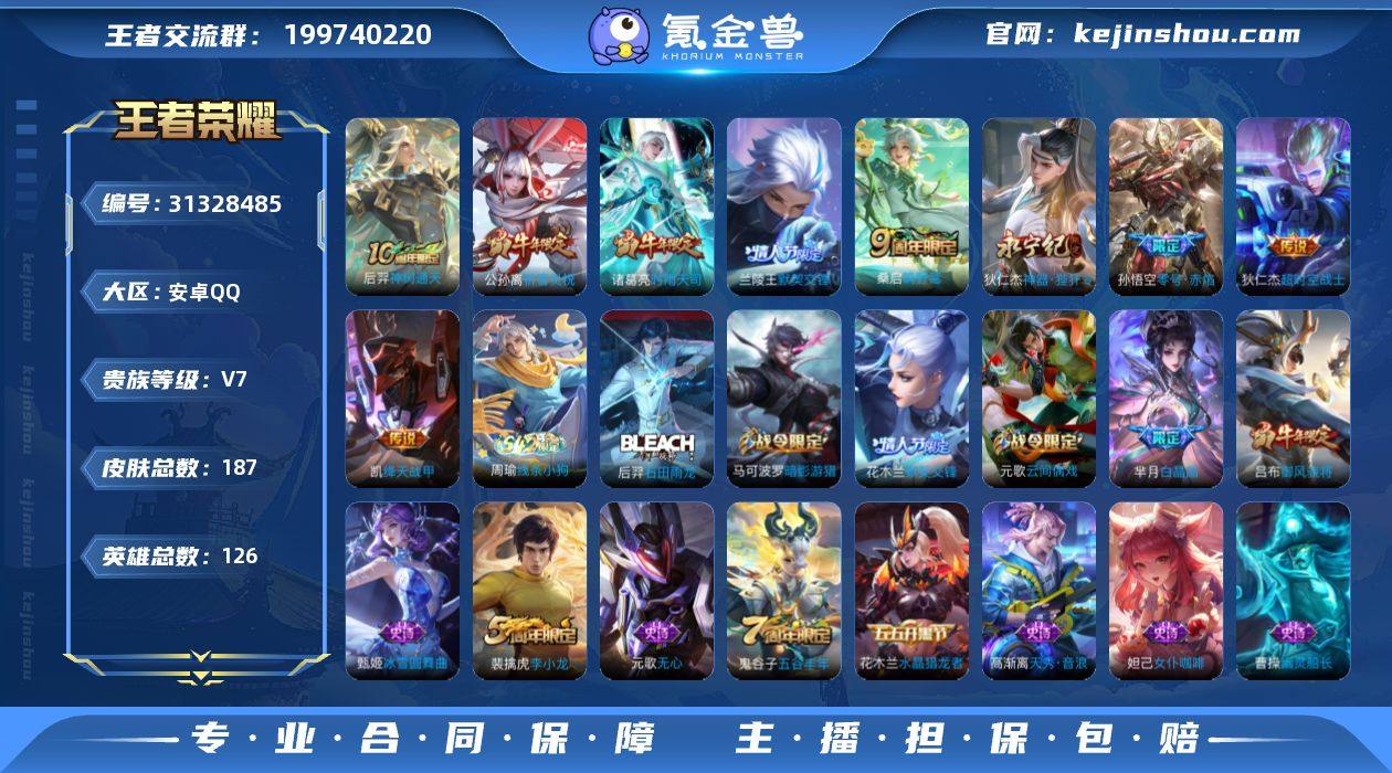 2216702 水晶231抽 3115紫星币 安卓Q-V7-永恒钻石I段位-126英雄-187皮肤-9传说-36史诗 【传说皮肤】:后羿神树通天,桑启鸣野蒿,狄仁杰神器狴犴令,兰陵王默契交锋,公孙离祈雪灵祝,诸葛亮时雨天司,铠绛天战甲,孙悟空零号赤焰,狄仁杰超时空战士 【限定皮肤】:姜子牙天穹之誓,狄仁杰阴阳师,赵云皇家上将,墨子神迹守卫,孙尚香蔷薇恋人,庄周高山流水,白起夜都怪侠,芈月白晶晶,吕布御风骁将,元歌云间偶戏,元歌无心,马可波罗暗影游猎,狄仁杰魔术师,狄仁杰万华元夜,狄仁杰神器狴犴令,达摩沙漠行僧,项羽海滩派对,老夫子醍醐杖,老夫子航海奇遇记,程咬金演武夺筹,兰陵王默契交锋,兰陵王金庭之子,花木兰默契交锋,亚瑟潮玩骑士王,孙悟空零号赤焰,牛魔奔雷神使,李元芳云中旅人,钟馗驱傩正仪,杨玉环遇见飞天,鬼谷子原初探秘者,鬼谷子五谷丰年,诸葛亮时雨天司,苏烈千军破阵,弈星混沌棋,公孙离祈雪灵祝,沈梦溪大漠名商,明世隐疑决卦,明世隐吟游魔法,裴擒虎李小龙,裴擒虎擒涛扼浪,云中君纤云弄巧,猪八戒西部大镖客,西施玲珑珍味,鲁班大师探海日志,桑启海盐诗旅,艾琳女武神,张良古海寻踪,鬼谷子天穹祈灯 【年限皮肤】:公孙离祈雪灵祝,诸葛亮时雨天司,吕布御风骁将,牛魔奔雷神使 【赛季限定】:弈星混沌棋,明世隐疑决卦,老夫子醍醐杖,鬼谷子原初探秘者,狄仁杰万华元夜,程咬金演武夺筹,钟馗驱傩正仪,苏烈千军破阵,达摩沙漠行僧,兰陵王金庭之子,沈梦溪大漠名商,李元芳云中旅人,桑启海盐诗旅,裴擒虎擒涛扼浪,鲁班大师探海日志,张良古海寻踪,鬼谷子天穹祈灯,姜子牙天穹之誓,东皇太一噬灭天穹,钟馗虚灵犬护 【战令限定】:马可波罗暗影游猎,猪八戒西部大镖客,元歌云间偶戏,亚瑟潮玩骑士王,老夫子航海奇遇记,墨子神迹守卫,明世隐吟游魔法,白起夜都怪...