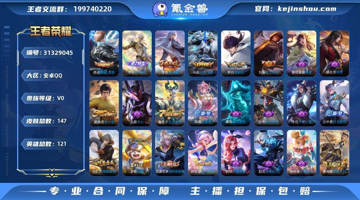 贵族等级:V0 典藏皮肤数:1 珍品无双皮肤数:0 无双皮肤数:1 珍品传说皮肤数:0 传说皮肤数:4 史诗皮肤数:34 皮肤数:147 英雄数:121 段位:黄金