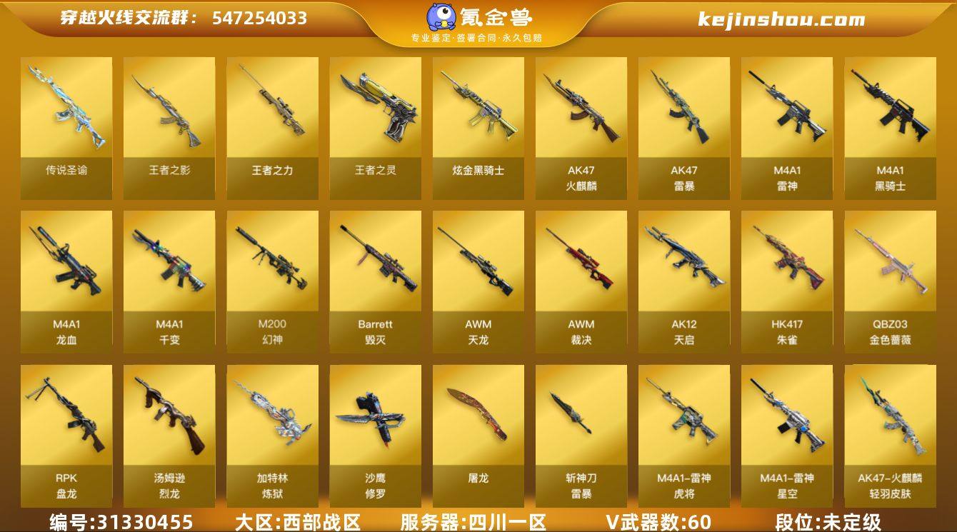 四川一区-65V-5王者-1炫金 【传说武器】:传说圣谕 【热门武器】:传说圣谕,QBZ03-金色蔷薇,HK417-朱雀*2,M200-幻神,M4A1-黑骑士*3,汤姆逊-烈龙*6,RPK-盘龙*4,加特林-炼狱,斯泰尔-蝴蝶,USP-雷暴,沙鹰-修罗*2 【王者炫金武器】:炫金骑士,王者之影,王者之力,王者之灵 【音效卡】:M4A1-雷神音效卡,M4A1-黑骑士音效卡,Barrett-毁灭音效卡,AWM-裁决音效卡 【稀有皮肤】:雷神-星空,雷神-虎将,火麒麟-华夏之心,火麒麟-轻羽皮肤,AWM-天龙-传奇白鲨,AWM-CFS 2020 【角色】:王者-瞳-闭月羞花,零,樱,春,炽天使,审判者,新灵狐者,青霞仙子 【人偶武器】:斯泰尔-蝴蝶,COP-旗袍,迷你牛魔王,生化手雷-机甲核心 【暴走生化】:斯泰尔-蝴蝶 【挑战大师】:神圣爆裂者III 【英雄级武器】:AK47-雷暴,USP-雷暴,斩神刀-雷暴,QBZ03-金色蔷薇,HK417-朱雀*2,M4A1-雷神*2,M4A1-黑骑士*3,RPK-盘龙*4,加特林-炼狱,汤姆逊-烈龙*6,AK47-火麒麟*3,AK12-天启*2,AWM-天龙,Barrett-毁灭,AWM-裁决,M4A1-龙血,M200-幻神,M4A1-千变,沙鹰-修罗*2,屠龙 【特殊枪械】:蝴蝶斯泰尔+6烈龙,3黑骑士,6烈龙,4盘龙,1炼狱,1蝴蝶斯泰尔