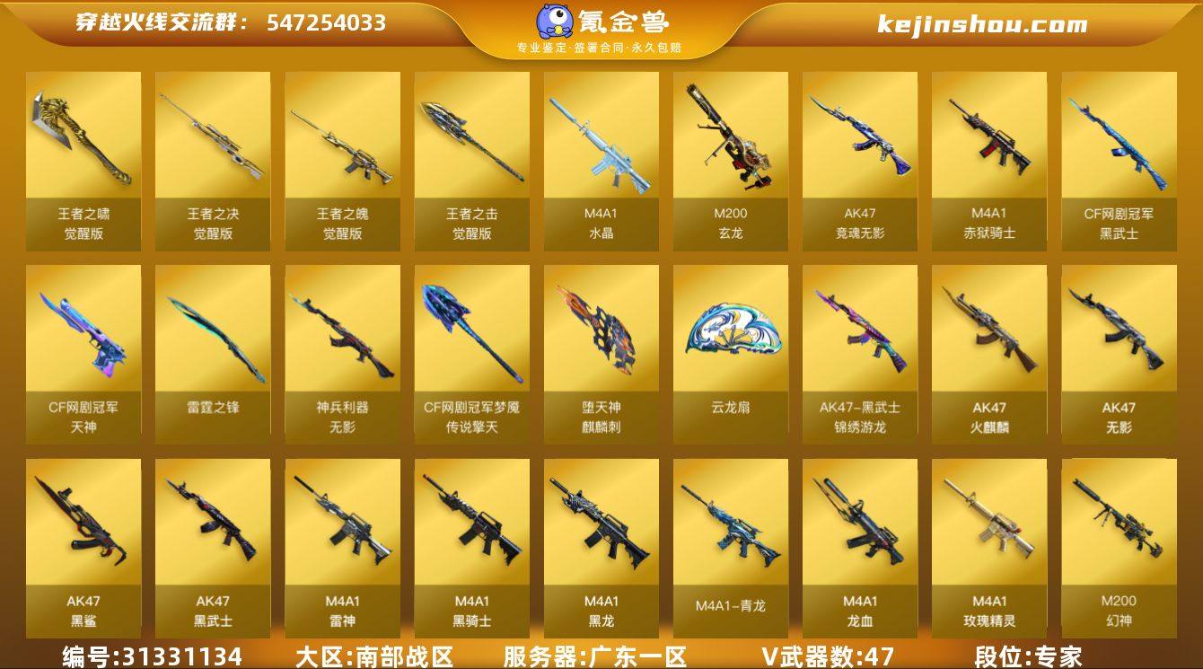 段位:专家 VIP等级:VIP6 V武器数:47 王者武器数:4 王者之啸-觉醒版,王者之决-觉醒版,王者之魄-觉醒版,王者之击-觉醒版 AK47-竞魂无影,M200-玄龙,M4A1-水晶,M4A1-赤狱骑士,黑武士-CF网剧冠军,天神-CF网剧冠军,雷霆之锋,无影-神兵利器,擎天-CF网剧冠军,麒麟刺-堕天神,云龙扇,AK47-黑武士-锦绣游龙,AK47-火麒麟,AK47-无影,AK47-黑鲨,AK47-黑武士,M4A1-雷神,M4A1-黑骑士,M4A1-黑龙,M4A1-青龙,M4A1-龙血,M4A1-玫瑰精灵,M200-幻神,Barrett-毁灭,Barrett-极光,蔷薇大炮,AWM-天龙,Kar98k-星神,AA-12-雷霆,AK12-天启,AN94-超新星,HK417-朱雀,QBZ03-金色蔷薇,9A91-烈火,屠龙,龙啸,麒麟刺,擎天,擎天-竞技荣光,AK-47-猩红传说,天神 传说影煞 王者-沙漠玫瑰,王者-瞳-闭月羞花 荒漠琉璃,葵,零,零·纪元,迷迭香,魅影,樱,雅典娜 M4A1-黑骑士音效卡,Barrett-毁灭音效卡,M4A1-雷神音效卡,AK47-火麒麟音效卡 卖家说:QQ等级128 和平 王者全部白给买到就赚