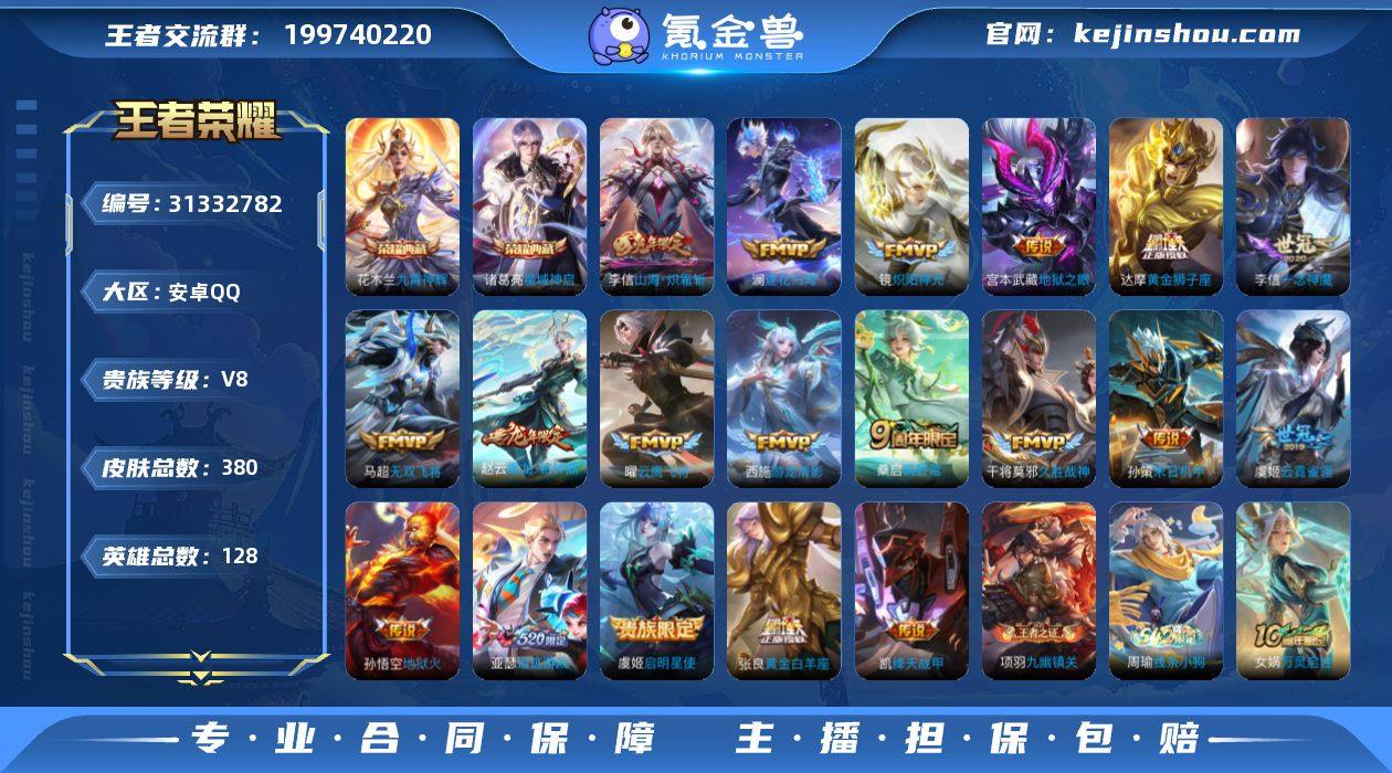 王者19235,不可二次,3346星币,安卓Q-V7-至尊星耀IV段位-127英雄-300皮肤-1典藏皮肤-1无双-10传说-70史诗 【英雄全皮】:孙权全皮,空空儿全皮,影全皮,海诺全皮 【荣耀典藏】:貂蝉幻阙歌 【无双皮肤】:铠神罪 【传说皮肤】:后羿神树通天,大司命死亡执政官,女娲愿照千秋盛,妲己愿照众生和,虞姬愿照岁时盈,云缨幻光神枪,桑启鸣野蒿,孙悟空齐天大圣,花木兰冠军飞将,貂蝉仲夏夜之梦 【限定皮肤】:蒙犽顽岩魄,姜子牙天穹之誓,狄仁杰阴阳师,赵云皇家上将,孙尚香蔷薇恋人,庄周高山流水,元歌云间偶戏,元歌无心,狄仁杰魔术师,狄仁杰万华元夜,达摩星际陆战队,达摩沙漠行僧,项羽海滩派对,老夫子醍醐杖,程咬金演武夺筹,兰陵王金庭之子,亚瑟潮玩骑士王,孙悟空齐天大圣,李元芳云中旅人,钟馗驱傩正仪,鬼谷子原初探秘者,鬼谷子五谷丰年,苏烈千军破阵,百里玄策原初追逐者,沈梦溪大漠名商,明世隐疑决卦,裴擒虎李小龙,裴擒虎擒涛扼浪,米莱狄胡桃异想国,云中君纤云弄巧,嫦娥拒霜思,嫦娥暖冬兔眠,西施玲珑珍味,鲁班大师探海日志,桑启海盐诗旅,暃星界游侠,戈娅驭风魔法,艾琳女武神,阿古朵江河有灵,张良古海寻踪,蒙犽百解令,高渐离燃音魔法,妲己灵卜魔法,鬼谷子天穹祈灯,姬小满妄想食味,沈梦溪龙舞盛年,刘邦剑破天穹,上官婉儿群星魔术团,程咬金群星魔术团,镜青焰无极,项羽苍威无极,海诺心动手记,周瑜熔金海岸 【年限皮肤】:女娲愿照千秋盛,妲己愿照众生和,虞姬愿照岁时盈 【赛季限定】:明世隐疑决卦,老夫子醍醐杖,鬼谷子原初探秘者,狄仁杰万华元夜,程咬金演武夺筹,钟馗驱傩正仪,苏烈千军破阵,达摩沙漠行僧,兰陵王金庭之子,沈梦溪大漠名商,李元芳云中旅人,桑启海盐诗旅,裴擒虎擒涛扼浪,鲁班大师探海日志,张良古海寻踪,鬼谷子天穹祈灯,刘邦剑破...