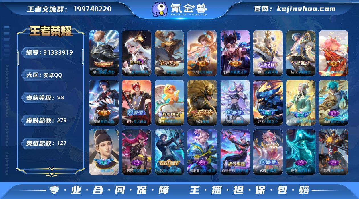 小国蔡文姬·鸣剑曳影·金色仲夏夜·寅虎焰心·李逍遥·愿照山河定·愿照福禄聚·玄雷天君·牧神诗旅·淬星耀世·可二次】w13189-安卓Q-127英雄-279皮肤-13王者印记-300铭文-贵族积分5w【贵族8】【1典藏·2星传说·12传说·7按键】【因赛季更新游戏段付以上号为准!】 【英雄全皮】:司空震全皮,影全皮 【荣耀典藏】:李白鸣剑曳影 【星元皮肤】:貂蝉金色仲夏夜,鲁班七号寅虎焰心 【传说皮肤】:后羿神树通天,司空震愿照山河定,蔡文姬愿照福禄聚,云缨幻光神枪,嬴政玄雷天君,桑启鸣野蒿,庄周牧神诗旅,赵云淬星耀世,曜李逍遥 ,周瑜音你心动,虞姬启明星使,貂蝉仲夏夜之梦 【限定皮肤】:蔡文姬夏日便利店,虞姬夏日便利店,姜子牙天穹之誓,李白谪仙醉月,狄仁杰阴阳师,赵云皇家上将,赵云引擎之心,墨子神迹守卫,嬴政优雅恋人,庄周高山流水,高渐离死亡摇滚,钟无艳超时空战士,孙膑天狼运算者,白起夜都怪侠,芈月幻夜卜梦,元歌无心,甄姬落雪兰心,马可波罗逐梦之星,狄仁杰魔术师,狄仁杰万华元夜,达摩星际陆战队,达摩沙漠行僧,项羽海滩派对,老夫子航海奇遇记,关羽冰锋战神,程咬金演武夺筹,王昭君午后时光,兰陵王金庭之子,亚瑟潮玩骑士王,孙悟空孙行者,后羿圣弓游侠,李元芳云中旅人,虞姬启明星使,钟馗驱傩正仪,干将莫邪真爱魔法,雅典娜黎明之约,鬼谷子五谷丰年,黄忠火炮绅士,苏烈千军破阵,百里玄策原初追逐者,百里守约朱雀志,梦奇顽趣,沈梦溪星空之诺,沈梦溪大漠名商,明世隐吟游魔法,裴擒虎李小龙,裴擒虎擒涛扼浪,狂铁电玩高手,米莱狄胡桃异想国,嫦娥拒霜思,嫦娥暖冬兔眠,曜李逍遥 ,鲁班大师探海日志,桑启海盐诗旅,暃星界游侠,司空震地狱燃心,张良古海寻踪,沈梦溪龙舞盛年 【年限皮肤】:百里守约朱雀志,司空震愿照山河定,蔡文姬愿照福禄聚 【赛季限定】:狄仁杰万...