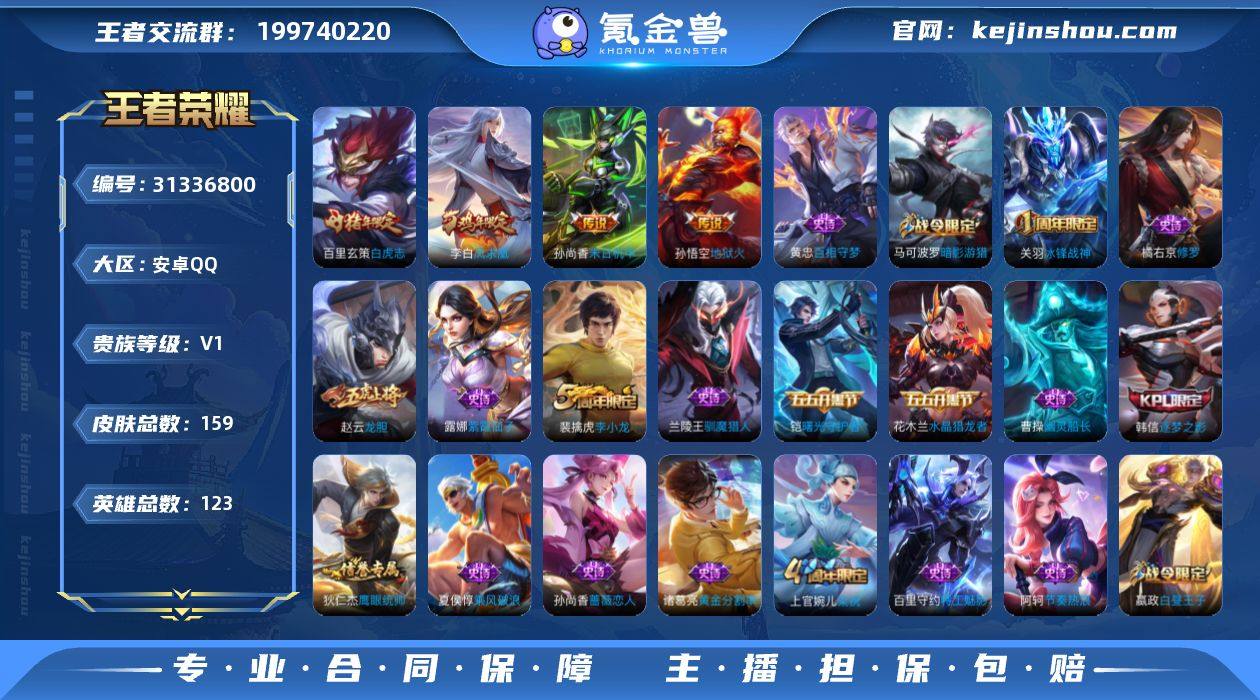 贵族等级:V1 典藏皮肤数:0 珍品无双皮肤数:0 无双皮肤数:0 珍品传说皮肤数:0 传说皮肤数:4 史诗皮肤数:34 皮肤数:159 英雄数:123 段位:绝世王者 卖家说:急出
