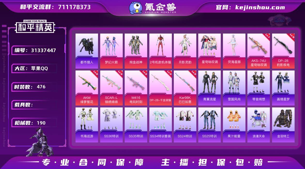 战神框 都市猎人 红螳螂 梦幻火箭 8号机 Mark.06 3稀有6粉装7特效枪11热门127套装190枪皮 54020热力值 14印记 历史无敌战神 【3稀有】 AKM-缤纷海域 都市猎人 浪漫天命 【6粉装】 红螳螂 梦幻火箭 荧海星豚 月影灵韵 星穹咏叹调 绚金战神 【7特效枪】 SCAR-L-锦绣绵绵 (5级) M416-电玩时刻 (5级) AKS-74U-星穹咏叹调 (7级) AKM-绿萝繁花 (5级) Kar98K-巳巳如意 (5级) DP-28-千金淑猫 (5级) DP-28-豹影疾电 (5级) 【11热门】 8号机 Mark.06 龟仙人 金羽特工 VS追光队服 水银刺客 狂沙舞者 破蛋小黄鸡 极速红龙 M762-奇异狩猎者 S686-奇异狩猎者 【1飞行器】 星夜魔法师飞行翼 【1头盔】 梦幻火箭头盔 【1背包】 梦幻火箭背包 营地ID:763599287