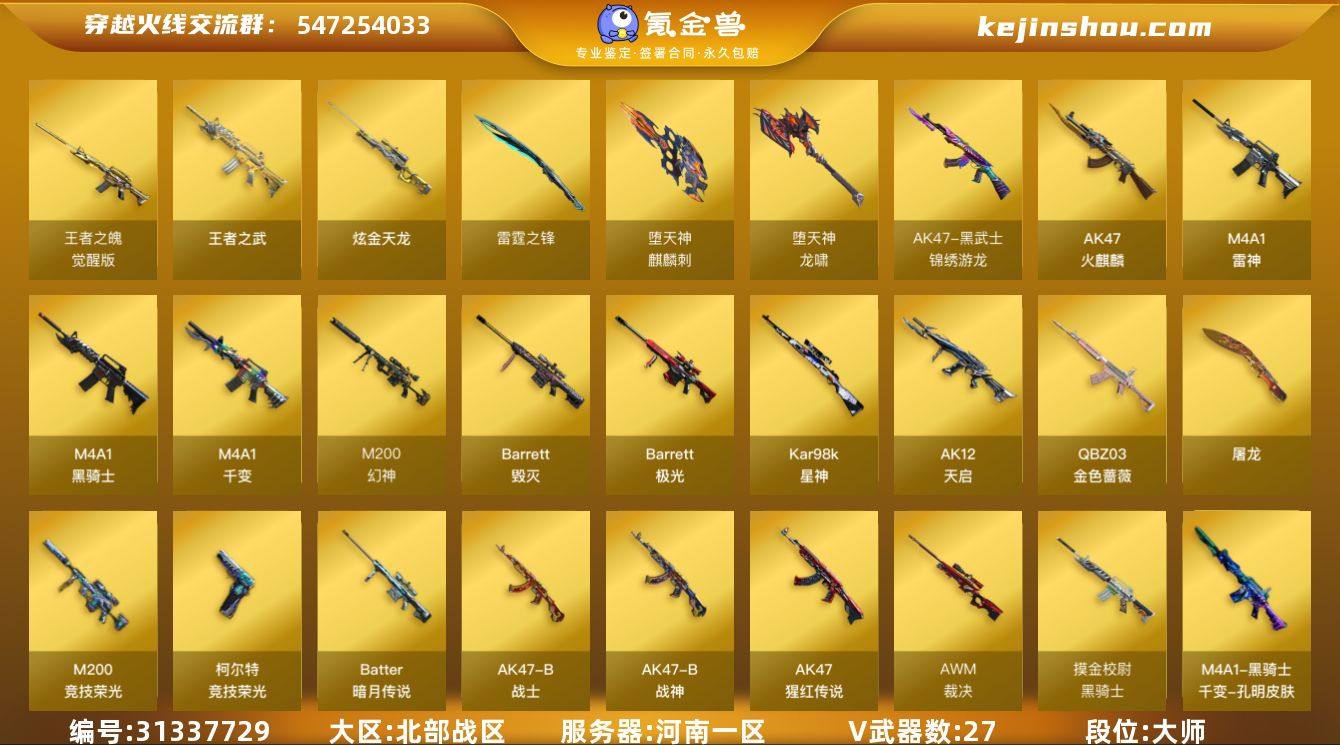 段位:大师 V武器数:27 王者武器数:2 炫金武器数:1 王者之魄-觉醒版,王者之武 炫金天龙 雷霆之锋,麒麟刺-堕天神,龙啸-堕天神,AK47-黑武士-锦绣游龙,AK47-火麒麟,M4A1-雷神,M4A1-黑骑士,M4A1-千变,M200-幻神,Barrett-毁灭,Barrett-极光,Kar98k-星神,AK12-天启,QBZ03-金色蔷薇,屠龙,M200-竞技荣光,柯尔特-竞技荣光,Barrett-暗月传说,AK47-B-战士,AK47-B-战神,AK-47-猩红传说,裁决 AWM-裁决音效卡,M4A1-黑骑士音效卡,Barrett-毁灭音效卡