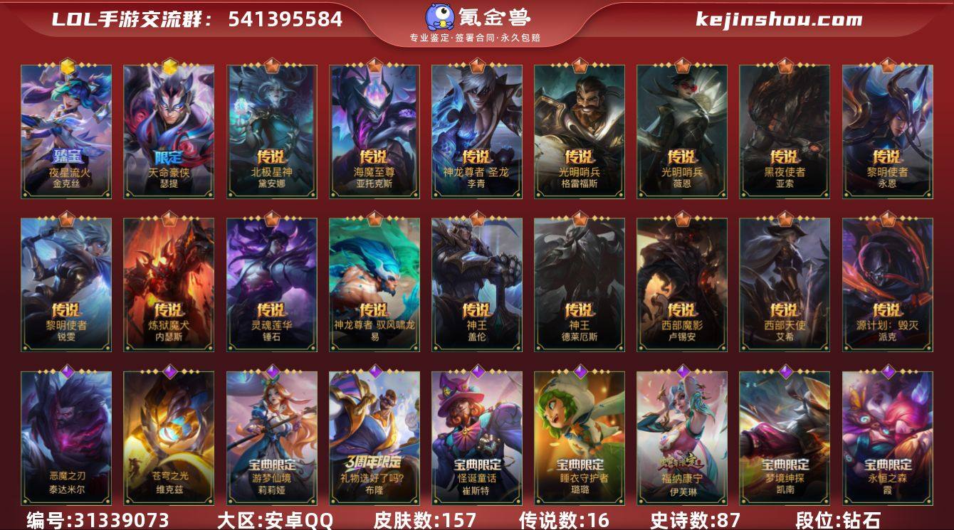 实名: 可修改 段位: 钻石 皮肤数: 157 神话皮: 天命豪侠 瑟提,夜星流火 金克丝 传说皮: 光明哨兵薇恩,黑夜使者亚索,黎明使者锐雯,炼狱魔犬,神龙尊者 驭风啸龙,神王盖伦,神王诺手,西部魔影卢锡安,西部天使寒冰,灵魂莲华锤石,黎明使者永恩,光明哨兵格雷福斯,源计划:毁灭,神龙尊者 圣龙 李青,海魔至尊 亚托克斯,北极星神 黛安娜 亮点: 【优质装备】:光明哨兵薇恩,黑夜使者亚索,黎明使者锐雯,炼狱魔犬,神龙尊者 驭风啸龙,神王盖伦,神王诺手,西部魔影卢锡安,西部天使寒冰,玉剑传说 武剑仙,灵魂莲华锤石,光明哨兵格雷福斯