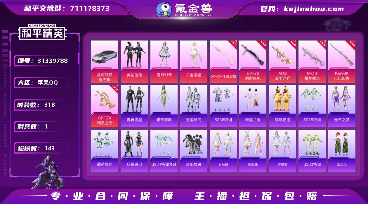 【精品号手慢无】可换绑 时装318 枪械144 载具1 战备86 英伦信使,千金淑猫,雪月幻音 星河领航(磐石银) 七级DP-28-千金淑猫 五级Kar98K-巳巳如意,五级AUG-暖羊咩咩,五级MK14-甜梦熊击,五级DP-28-豹影疾电 三级GROZA-精灵之光