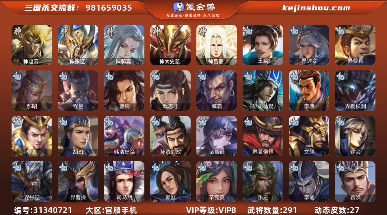 官阶:骠骑将军;VIP等级:VIP8;史诗武将数量:32;动态皮肤数量:27;武将总数:291;史诗宝珠数量:19;将魂数量:280;神将:4;魏国史诗武将:12;蜀国史诗武将:6;吴国史诗武将:4;群史诗武将:12 神赵云,神张辽,神郭嘉,神太史慈,王粲,界钟会,界曹真,郝昭,曹纯,戏志才,程昱,谋马超,诸葛瞻,周群,张星彩,沙摩柯,花鬘,周处,吴景,界朱然,界徐盛,星黄忠,苏飞,麹义,沮授,界李儒,公孙康,谋张角,许攸,星董卓,兀突骨,司马昭,神吕蒙,SP关羽,SP蔡文姬,乐进,曹昂,诸葛诞,朱灵,文聘,SP姜维,钟会,曹冲,郭淮,满宠,界王异,界曹操,界司马懿,界夏侯惇,界张辽,界许褚,界郭嘉,李典,曹真,韩浩史涣,陈群,曹叡,钟繇,司马朗,李通,孙资刘放,辛宪英,鲁芝,杜畿,界曹植,界满宠,界郭淮,卞夫人,华歆,蔡贞姬,袁涣,崔琰,阮慧,谋徐晃,谋于禁,界曹休,牵招,胡班,界夏侯渊,臧霸,唐咨,SP孙尚香,关银屏,夏侯霸,马良,关兴张苞,廖化,界马岱,关平,简雍,刘封,界法正,界关兴张苞,界刘备,界关羽,界张飞,界赵云,界马超,SP徐庶,吴懿,周仓,张松,糜竺,马忠,李严,界黄月英,严颜,界姜维,张翼,杨仪,界廖化,邓芝,界简雍,费祎,糜夫人,界周仓,向宠,彭羕,谋庞统,界张嶷,谋姜维,谋张飞,吴班,诸葛果,蒋琬费祎,糜芳傅士仁,甘夫人,鲁肃,孙茹,凌操,大乔小乔,诸葛恪,诸葛瑾,孙鲁育,程普,韩当,潘璋马忠,虞翻,朱然,界甘宁,界黄盖,界周瑜,界大乔,界陆逊,孙鲁班,朱桓,顾雍,朱治,全琮,孙登,界孙权,界孙尚香,潘濬,孙亮,严畯,吕岱,周鲂,界孙策,许贡,卫温诸葛直,界虞翻,界潘璋马忠,桥公,陈武董袭,孙翊,界孙鲁班,濮阳兴,谋吕蒙,谋周瑜,界孙休,界朱治,孟达,友庞统,伏完,刘协,界袁术,SP赵云,张宝,伏皇后,李儒,界张角,华雄,袁术,界华佗,界吕布,公孙瓒,蔡夫人,公孙渊,张鲁,蹋顿,严白虎,刘虞,曹节,界貂蝉,卢植,刘琦,界庞德,张绣,星张郃,界公孙瓒,孔融,羊祜,高览,谋刘赪,王濬,谋华雄,谋高顺,张任,李...