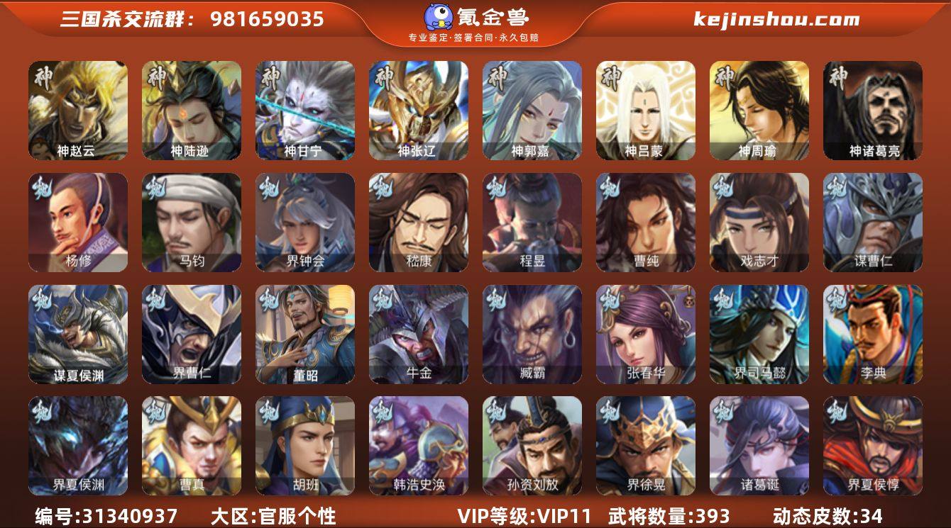 VIP等级: VIP11 官阶: 大将军 武将数量: 384 动态皮肤数量: 38 神将: 神郭嘉,神陆逊,神吕布,神孙策,神赵云,神关羽,神吕蒙,神周瑜,神诸葛亮 魏国武将: 刘晔,戏志才,曹纯,曹婴,程昱,嵇康,界钟会,魏-司马昭,王凌,文鸯,杨修,徐庶,张辽,SP蔡文姬,SP关羽,SP贾诩,SP姜维,SP庞德,卞夫人,蔡贞姬,曹昂,曹操,曹冲,曹洪,曹丕,曹仁,曹叡,曹嵩,贾逵,王异,张恭,鲁芝,界满宠,界曹植,满宠,荀攸,王基,钟繇,蒯越蒯良,郭嘉,牵招,荀彧,杜畿,界郭嘉,崔琰,界曹丕,界荀彧,朱灵,界王异,界许褚,界郭淮,华歆,陈群,界邓艾,界典韦,谋甄姬,司马孚,袁涣,李通,乐进,辛宪英,郭淮,毛玠,郭皇后,夏侯惇,曹植,司马朗,界曹操,许褚,界张辽,张郃,钟会,文聘,曹彰,界夏侯惇,诸葛诞,司马懿,甄姬,杨阜,界徐晃,徐晃,界曹仁,韩浩史涣,曹真,谋曹丕,典韦,界夏侯渊,谋荀彧,夏侯渊,李典,于禁,王双,邓艾,界司马懿,张春华,孟达-魏,臧霸,朱灵(国战),文钦-魏,曹髦,成济,玄·毌丘俭,李昭焦伯,司马伷,谋郭嘉 蜀国武将: 关索,界黄忠,谯周,沙摩柯,王平,谋赵云,谋黄忠,马云騄,徐庶,界魏延,杨仪,界关羽,界诸葛亮,邓芝,界伊籍,严颜,界黄月英,界张嶷,赵云,张松,彭羕,李丰,界刘备,界刘禅,谋姜维,刘封,糜竺,谋庞统,黄月英,刘巴,关羽,王甫赵累,吴懿,界廖化,祝融,张飞,黄皓,魏延,界周仓,谋祝融,马忠,界法正,糜夫人,界孟获,刘禅,界赵云,界姜维,张翼,关银屏,界祝融,SP孙尚香,SP徐庶,卧龙诸葛,周仓,简雍,谋孟获,界关兴张苞,诸葛亮,界张飞,界卧龙诸葛,法正,赵统赵广,陈到,界马岱,关平,马岱,界庞统,庞统,诸葛果,谋张飞,马谡,马超,来敏,廖化,关兴张苞,谋关羽,孟获,秦宓,吴苋,夏侯氏,姜维,黄忠,刘备,界马超,李严,马良,蒋琬费祎,刘谌,蜀-孟达,彭羕(国战),甘夫人,SP甘夫人,势陈祗 吴国武将: 界步练师,界徐盛,骆统,文鸯,界朱桓,潘濬,陆绩,张温,周泰,全琮,吕蒙,诸葛恪,界孙尚香,界顾雍,大乔小乔,谋...
