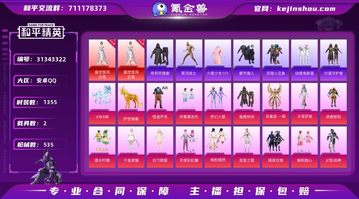 热力值:187878 载具数:2 时装数:1355 枪械数:535 战备数:360 游戏等级:76 卓越印记:11 传奇印记:9 绝世印记:7 三级盛世惊鸿-云鸾 暗夜玫瑰,白勺歌姬,呆萌星弥,凤凰座 一辉,放客神游,怪诞乔克,虎啸骄阳,幻影战神,奇迹舞步-美琪,精灵娃娃,极限特训,零号机款机体服,林间仙鹿,冷漠罗丽,梦幻火箭,女娲灵识,千金淑猫,飒粉甜心,圣辉之星,天使彩虹糖,圣堂之誓,桃粉嫣然,未来领航者,桀骜红莲,炫光之旅,星穹咏叹调,香水柠檬,星之彼岸,荧海星豚,仲夏莫吉托,宙之时溯 八级M416-灵猫魔法师,七级AUG-星之彼岸,七级GROZA-焦糖拿铁,七级M762-激战未来,七级破片手榴弹-热量炸弹,七级SCAR-L-天蓬元帅,七级UMP45-玉魂晶魄,六级AKM-幽焰骑士,六级蜜獾-荧海星豚,五级DP-28-豹影疾电,五级Kar98K-巳巳如意,五级M416-电玩时刻,五级MG-36-幻彩电音,五级MG3-洛神天依,五级MK14-闲梦青缨,五级SCAR-L-梦幻火箭,五级UMP45-量子极限,三级DP-28-千金淑猫,三级Vector-最终圣卫者,一级蜜獾-异瞳寒姬,一级AKM-炫紫旋律,一级M416-女娲灵识,一级M416-暖熊萌萌,一级M416-五爪金龙,一级M416-至情至圣,一级SCAR-L金蛇镇世 冰绡玉鳞,护世瑞兽 炫彩糖果降落伞,炫彩糖果飞行器,异瞳寒姬降落伞,灵珠游龙飞行器,喜羊羊与灰太狼降落伞,拂晓神骑飞行器,酣梦熊熊飞行器,镜光幻境飞行翼,镜域双华-灵镜之阶,灵猫魔法师飞行器,梦幻火箭飞行器,天之羽翼飞行器,王牌四分卫飞行器,万象金身飞行器,祥瑞起舞飞行器,星之彼岸飞行器,终晖之翼飞行器,暗夜玫瑰降落伞,BEARBRICK降落伞,垂柳戏鸭降落伞,绯穹魔姬降落伞,粉樱探戈降落伞,幻彩电音降落伞,环太平洋降落伞,海渊国主降落伞,辉羽雀灵降落伞,黄族统领降落伞,精灵梦叶罗丽降落伞,金蛇镇世降落伞,锦绣火鲤降落伞,极限特训降落伞,镜域双华降落伞,快乐主宰降落伞,恐龙拽拽降落伞,临安公主降落伞,灵猫魔法师降落伞,蓝莓炮弹降落伞,洛神天依降落伞,梦幻火箭降落伞,萌物绒绒降落伞,千金淑猫降落伞,绮梦青鸾降落伞,忍者神龟降落伞,沙丘之主降落伞,四圣焕新降落伞,圣堂之誓降落伞,桃粉嫣然降落伞,天启纪元降落伞,甜心宝贝降落伞,未来歌姬降落伞,未来战士降落伞,王牌四分卫降落伞,闲梦青缨降落伞,星穹咏叹调降落伞,香水柠檬降落伞,荧海星豚降落伞,银刃赛罗降落伞,樱桃泡泡降落伞,智耀战神降落伞 SS37特训,青翼流星,雪国风尚,画境星梦,琴音绮想,SS36特训,火箭少女101,冥河战士,奇异狩猎者,炫彩糖果,粉黛兰香,绯色魅影,萌鸡速递,紫俏灵猫,风迹短诗,秘语星愿,SS35特训,午间小调,元气之梦,漫游都市,懒羊羊,美羊羊,薄荷星砂,狂鲨锋刃,凌霄紫焰,擎苍青焰,SS34特训套装,游乐,朱霞炽焰,暗黑骑手,暗影哥特,暗夜傀儡,暗夜契约,暗夜武装,暗夜之虎,冰川格斗者,冰川特警,冰冻风暴,缤纷果语,暴风机械师,缤纷焰火,北国孤狼,滨海厨神,滨海假日,冰河战士,冰晶湖光,白色伏地魔,贝斯之夜,白熊同盟,冰原奔狼,冰原使者,纯白跃动,春光漫游,彩虹兔,雏菊兔兔,长空猛禽,丛林猎人,潮流先锋,潮流游乐家,潮萌小黄鸭,超能勇士,传奇侦探,春日漫步,创世·幻影,炽焰拳师,纯真浪花,顶瓜瓜,动感兔斯基,蝶变,大橘大利,呆萌铁蟹,都市丽猫,都市猎人,淡雅花蕊,电音精灵,飞驰魅影,绯格组合,覆海蛟龙,粉红小猪,疯狂小兔子,粉恋花,粉团憨憨,风舞幻音,福星