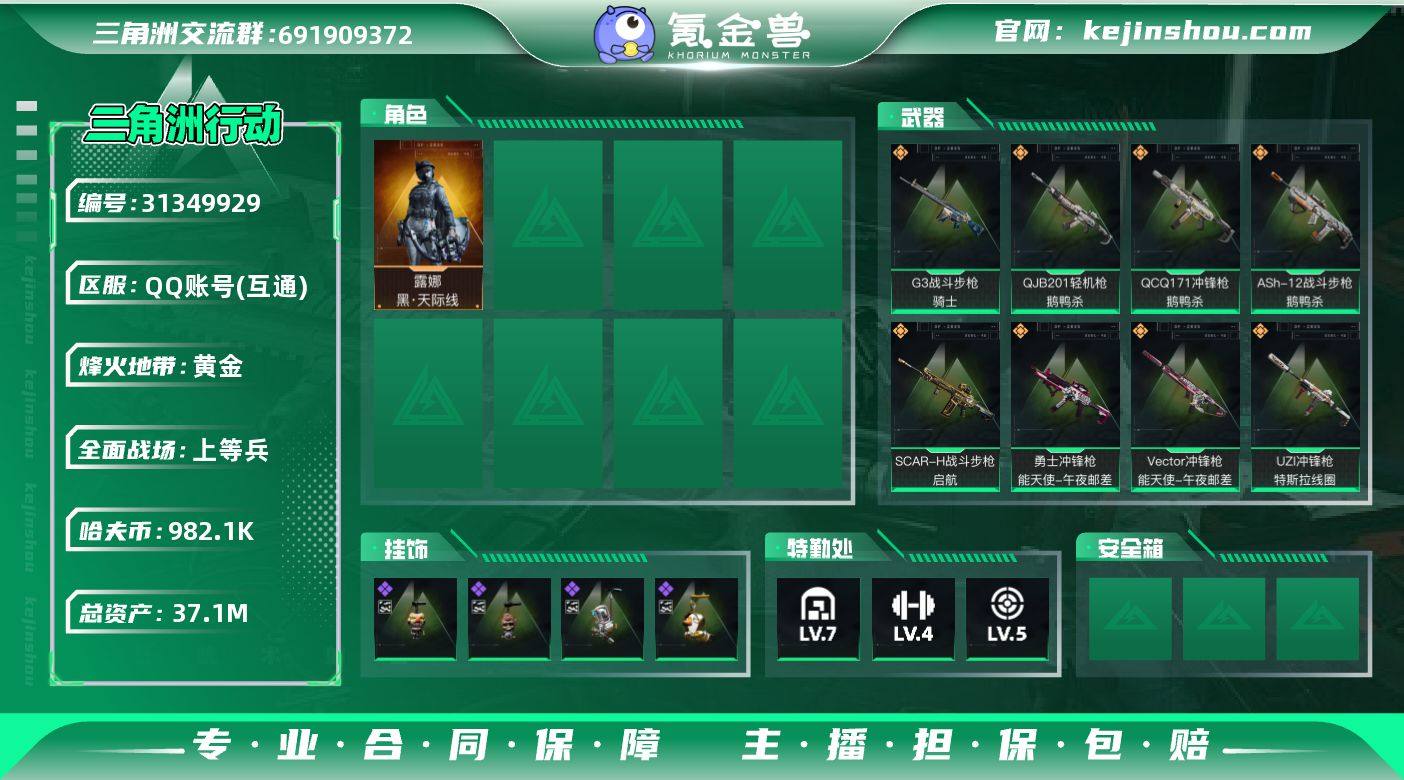 实名:可二次实名 总资产:37.1M 哈夫币:982.1K 烽火地带段位:黄金 烽火地带等级:54 全面战场段位:上等兵 全面战场等级:49 7级仓库,4级训练中心,5级靶场,5级指挥中心,1级潜水中心,3级防具台,3级工作台,3级制药台,3级技术中心,0级收藏室 战术部门等级:2 战斗部门等级:2 医疗部门等级:2 研发部门等级:2 后勤部门等级:2 曼德尔砖-气象感应:0 曼德尔砖-命运王牌:0 曼德尔砖-电玩高手:0 曼德尔砖-美杜莎:0