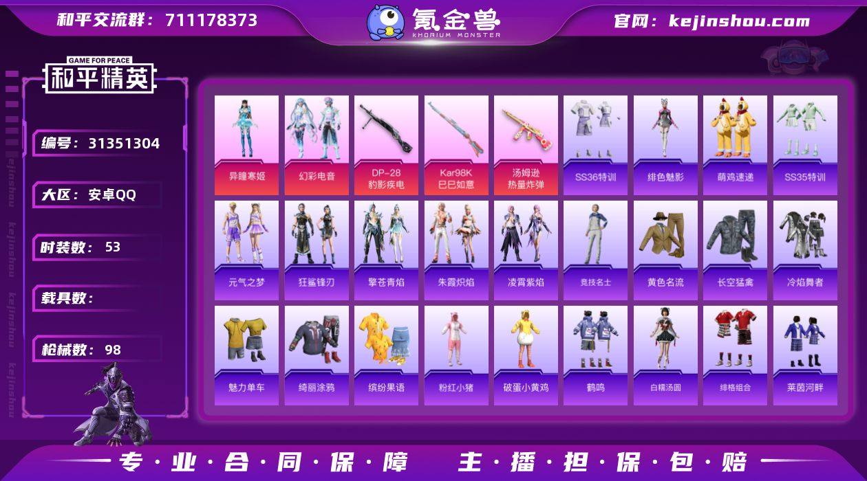 【0载具 3特效枪 2粉装 98枪皮 53套装】套装-老实芭蕉,角色-异瞳寒姬,套装-幻彩电音 Kar98K-巳巳如意,汤姆逊-热量炸弹,DP-28-豹影疾电 异域银装飞行器,鸡智如我飞行器,编号:ZPJIS47