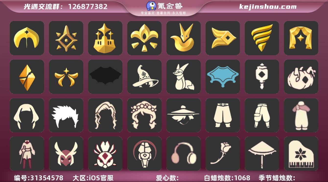 【1580】蜡烛数:1068/爱心数:175/毕业地图数:6/晨岛/云野/雨林/霞谷/墓土/禁阁/圣岛季/预言季/梦想季/集结季/小王子季/风行季/潜海季/表演季/破晓季/欧若拉季/双边耳坠/凤凰斗篷/队长面具/连帽斗篷/小王子发型/小王子套装/玫瑰花/风行毛领/蓝黄羽袖/单边小辫/黄眉企鹅面具/冥龙斗篷/留辫蘑菇头/高领舞服/透明蝶翼斗/巫师/圣诞鹿角/南瓜/蝙蝠套/瑞雪/灯笼/花憩茶桌/小憩茶桌/小狐狸/武士裤/背带裤/击剑裤/花环/红耳机/若笠/平顶帽/白金斗篷/绿芽/海洋斗/高音钢琴/搓澡巾/凤凰面具/阿努比斯/虚荣/花环长发/帝企鹅发/多羽发饰/贝壳发饰/玉兔发饰/雪花发夹/黑金斗篷/红金斗篷/燕尾斗篷/鳐鲲斗篷/雨伞/胜利号角/毕业手碟/情人秋千/中秋灯笼