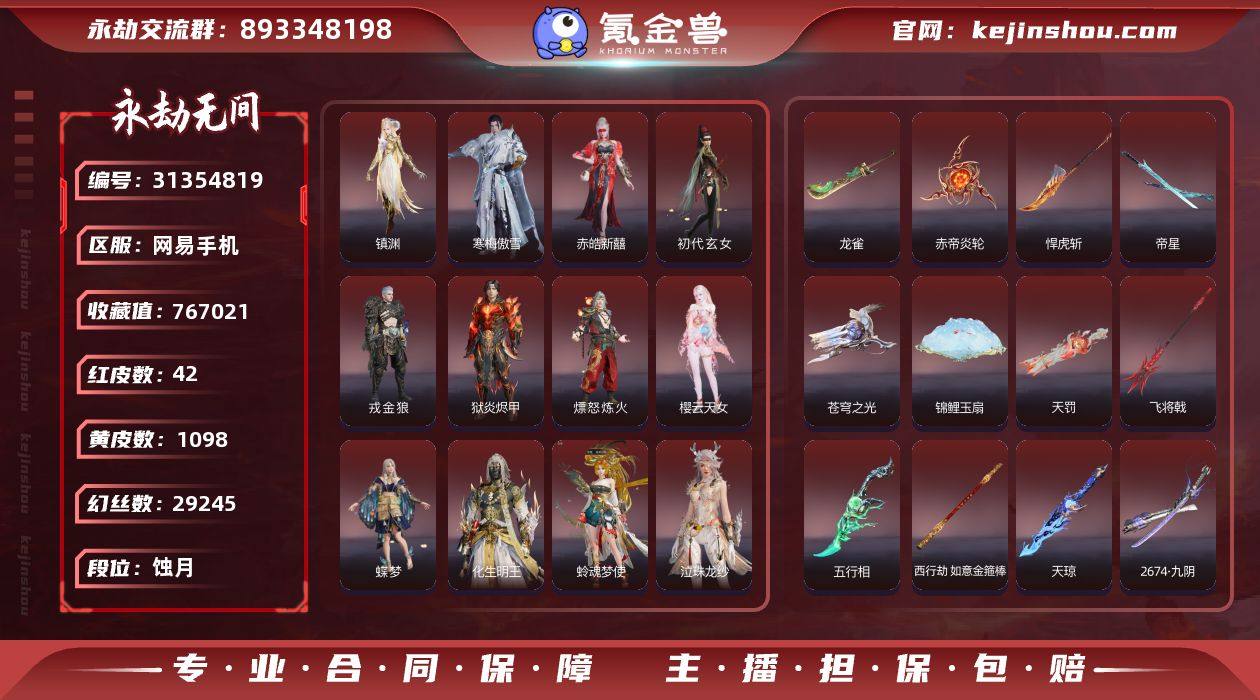红皮数:42 黄皮数:1098 收藏值:767021 幻丝数:29245 等级:510 三排段位:蚀月 通行证:已升级 镇渊,寒梅傲雪,赤皓新囍,初代玄女,戎金狼,狱炎烬甲,熛怒炼火,樱云天女,蝶梦,化生明王,蛉魂梦使,泣珠龙纱,凌霄之羽,通天狐袄,长天藏锦,星辉魔纱,朱雀星衣,监兵凶神,化道者,执明神君,流金晓锦,守墨麒,逐光者,画中仙 龙雀,赤帝炎轮,悍虎斩,帝星,苍穹之光,锦鲤玉扇,天罚,飞将戟,五行相,天琼,西行劫·如意金箍棒,2674·九阴,少阳剑,狂龙,凤求凰,灵狐幻刃,狼主,毕方 卖家说:有扇子谪星