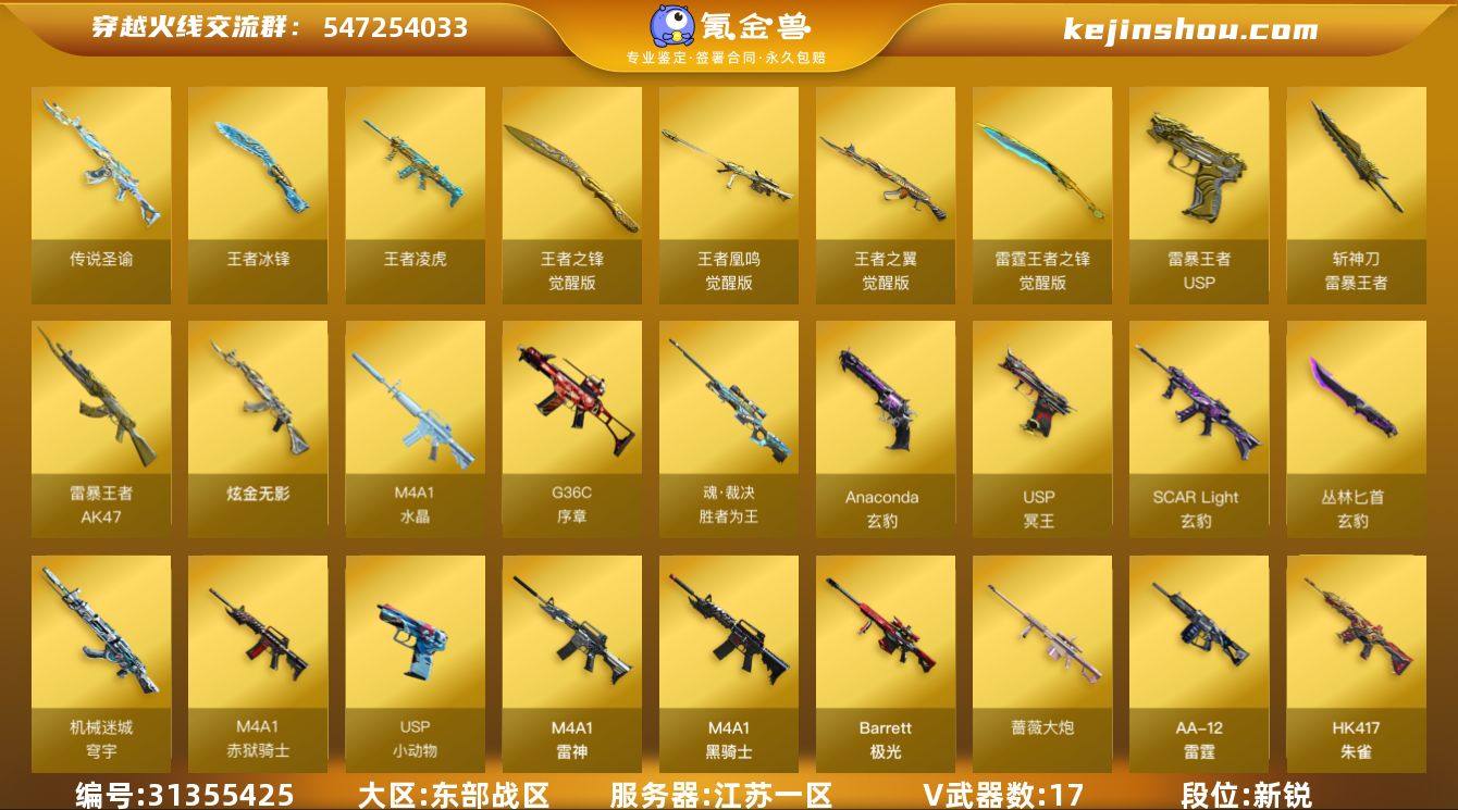 段位:新锐 VIP等级:VIP5 V武器数:17 王者武器数:9 炫金武器数:1 传说圣谕 王者冰锋,王者凌虎,王者之锋-觉醒版,王者凰鸣-觉醒版,王者之翼-觉醒版,雷霆王者之锋-觉醒版,USP雷暴王者,斩神刀-雷暴王者,AK47-雷暴王者 炫金无影 G36C-序章,魂·裁决-胜者为王,M4A1-水晶,Anaconda-玄豹,丛林匕首-玄豹,SCAR Light-玄豹,USP-冥王,机械迷城-穹宇,M4A1-赤狱骑士,USP-小动物,M4A1-雷神,M4A1-黑骑士,Barrett-极光,蔷薇大炮,AA-12-雷霆,HK417-朱雀,屠龙,擎天,炽芒蝶刃,USP-雷暴,斩神刀-雷暴,裁决 零·纪元,魅影 AWM-裁决音效卡,Barrett-极光音效卡 卖家说:买的号,连体王者200多皮安卓Q区,游戏里71V,带神秘背包金色字体,二次实名稳ip近期可改