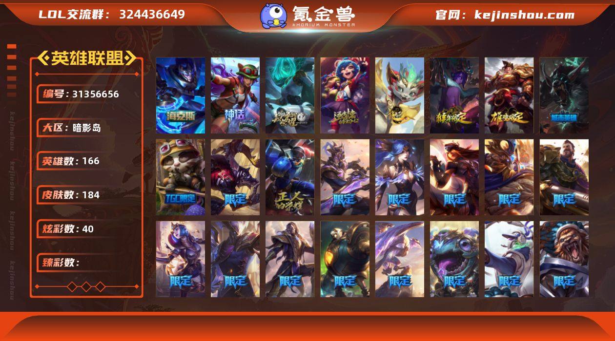 未定级段位-166英雄-184皮肤-40炫彩-0终极-4神话-26限定-17传说-48史诗【神话皮肤】:十周年纪念安妮,源代码乐芙兰,十五周年纪念希维尔,海克斯科技嘉文四世【珍稀头像】:红包头像【年限皮肤】:紫金罗刹莫甘娜,张辽文远,天龙之子斯莫德【海克斯皮肤】:海克斯科技嘉文四世【冰雪限定】:圣诞开心鬼提莫,圣诞狂欢基兰,雪默丁格【限定皮肤】:SSW辛吉德,SSW雷恩加尔,SSW锤石,胜利女神希维尔,胜利之树茂凯,胜利枪神格雷福斯,胜利女神奥莉安娜,胜利之剑亚托克斯,胜利枪神卢锡安,胜利机器人布里茨,胜利凤凰艾尼维亚,胜利巨口克格莫,胜利女神娑娜,胜利剑圣易,南瓜头费德提克,鬼影重重魔腾,密林猎手提莫,暗影沃里克,都铎王朝图奇,防暴天使凯尔【传说皮肤】:地狱之门卫士加里奥,邪鸦魅影乐芙兰,提莫约德尔人的一大步,欧米伽小队幽灵特工,烈焰雄心崔丝塔娜,合金巨兽努努和威朗普,鬼魂新娘莫甘娜,双重冰晶艾尼维亚,律政大亨蒙多,最终BOSS维迦,冰川巨兽墨菲特,炼狱魔犬内瑟斯,黯黑魔龙希瓦娜,苍穹之光韦鲁斯,宇航员诺提勒斯,金牌主播德莱文,灌篮高手德莱厄斯【史诗皮肤】:铁钩船长费德提克,重生之沙费德提克,铁血剑豪易,战争机器赛恩,火箭达人崔丝塔娜,法国皇室厄运小姐,国王泰达米尔,百夫长贾克斯,炼金狂士辛吉德,侏罗纪化石科加斯,战争血统蒙多,夜刃艾瑞莉娅,夜行义贼艾瑞莉娅,北领前线斯维因,绝代智将斯维因,符文战神雷克顿,死亡绽放伊莉丝,冰晶之核布兰德,地下拳王李青,法老王朝内瑟斯,四神之力乌迪尔,面包之王潘森,银色之牙阿卡丽,至高君王玛尔扎哈,星际迷航拉克丝,钢之逆鳞希瓦娜,暗影妖狐阿狸,铁血猎人雷恩加尔,白色死神韦鲁斯,源计划火菲奥娜,奥术大师吉格斯,永恒之森赫卡里姆,铁血帝皇德莱厄斯,生化骑士德莱厄斯,源代码丽桑卓,勇...