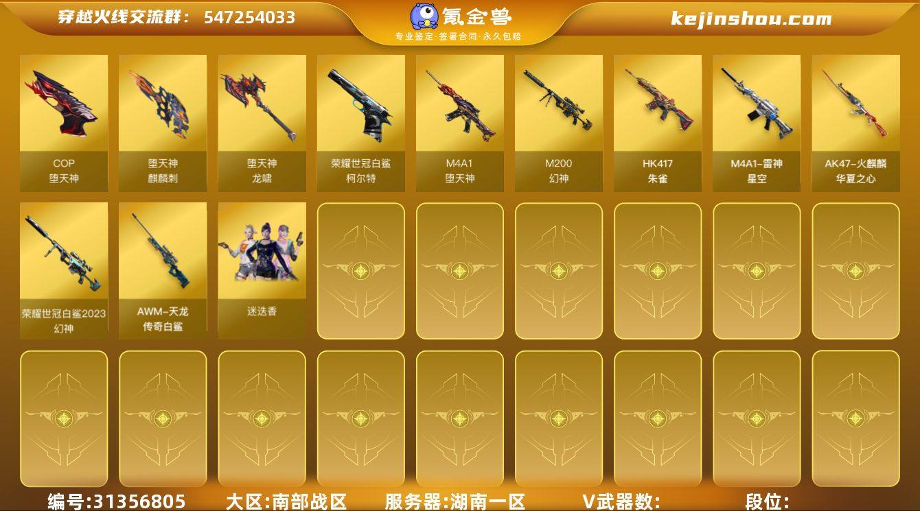 北方大区-56V-2王者武器数-2炫金武器数 【热门武器】:QBZ03-金色蔷薇,M4A1-青龙,M200-幻神,金色蔷薇-古蛇迷踪,修罗-古蛇迷踪,M4A1-黑骑士,汤姆逊-烈龙,加特林-炼狱*2,COP 357-幻灵*3 【王者炫金武器】:炫金骑士,炫金毁灭 【音效卡】:AK47-火麒麟音效卡,M4A1-雷神音效卡,Barrett-碧霄极光音效卡 【皮肤】:M200-幻神-黄忠皮肤,幻神-AG-CFPLS17冠军,裁决-羽掣 皮肤,雷神-烈虎皮肤,雷神-海滩派对 皮肤,雷神-源计划2.0专属 皮肤,雷神-化蛇 皮肤,火麒麟-华夏之心,毁灭-巅峰荣耀 皮肤,黑龙-能量核心,黑龙-美杜莎 皮肤,战神-紫绶金章皮肤,AK47-B-常胜将军-刘备,AK47-B-常胜将军-孙权,天神-暗月,屠龙-春桃 皮肤,龙啸-纸灯龙皮肤*2 【角色】:魅影,战地猎狐,蛇隐宗,奇洋探员,乔伊教练,修道士,云海玲珑,暗夜-X,初恋灵狐,芳心审判者,飞虎队-X,虎妞,娟娟,灵狐-花神,灵狐者-X,麻雀,曼陀罗-X,玫瑰花神,潘多拉-X,潘多拉-甜心教官,青霞仙子,蛇姬,蜀雪,铁骑荣耀,新娜塔莎,雪莉杨,雪莉杨-摸金校尉,影武者-X,游珑儿 【人偶武器】:天龙-曼陀罗,AWM-灵狐-15周年嘉年华,迷你裂空之翼,夺魂,迷你牛牛,生化手雷-机甲核心,迷你深渊冰龙-王绿豆*2,迷你艾比,迷你超能女侍,灵狐娃娃手雷 【暴走生化】:黑龙吞噬者,超级对讲机 【挑战大师】:神圣爆裂者III,冰龙粉碎者-白马银枪,激光毁灭者III-白马银枪 【英雄级武器】:AK47-火麒麟,M4A1-黑龙,M4A1-雷神,M4A1-黑骑士,AK12-天启,AK47-黑鲨,M4A1-青龙,黑武士-锦绣游龙,金色蔷薇-古蛇迷踪,QBZ03-金色蔷薇,王者之心-觉醒版,AK-47-猩红传说,黑骑士-海王,AK47-B-常胜将军,AWM-天龙,Barrett-毁灭,AWM-裁决,M200-幻神,王者之决-觉醒版,加特林-炼狱*2,汤姆逊-烈龙,COP 357-幻灵*3,修罗-古蛇迷踪,屠龙*4,...
