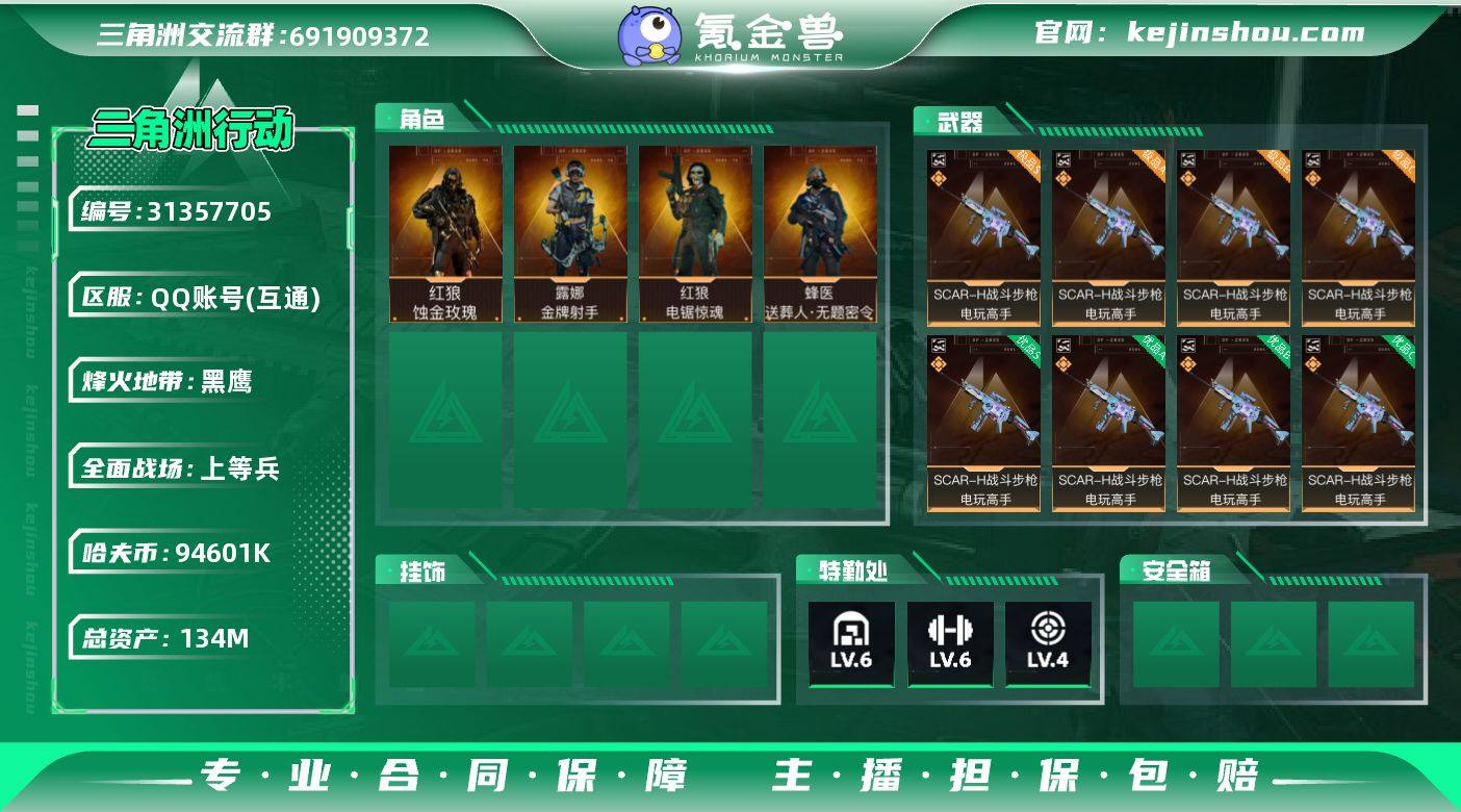 总资产(M):134M/哈夫币(K):94601K/哈夫币(K):94601K/全面战场等级:20_段位:上等兵/烽火地带等级:60_段位:黑鹰/红狼-蚀金玫瑰/蜂医-送葬人·无题密令(S5)/红狼-电锯惊魂/露娜-金牌射手(S7)/近战-影锋/近战-电锯惊魂/近战-信条/近战-黑鹰/SCAR-H战斗步枪-电玩高手/M4A1突击步枪-蚀金玫瑰/M4A1突击步枪-阿米娅/ASh-12战斗步枪-鹅鸭杀/M16A4突击步枪-狩猎时刻/SG552突击步枪-运动员/AK-12突击步枪-特斯拉线圈/SCAR-H战斗步枪-水墨云图/SCAR-H战斗步枪-启航/G3战斗步枪-狩猎时刻/CAR-15突击步枪-阿米娅/K437突击步枪-几何解构/KC17突击步枪-电锯惊魂/P90冲锋枪-信条/Vector冲锋枪-狩猎时刻/UZI冲锋枪-特斯拉线圈/SR-3M紧凑突击步枪-特斯拉线圈/勇士冲锋枪-能天使-午夜邮差/QCQ171冲锋枪-鹅鸭杀/S12K霰弹枪-电锯惊魂/725双管霰弹枪-送葬人-无题密令/M250通用机枪-骑士之心/QJB201轻机枪-鹅鸭杀/M14射手步枪-电锯惊魂/SR-25射手步枪-信条/复合弓-黑-天际线/ASh-12战斗步枪-无极限/M16A4突击步枪-竞赛选手/AUG突击步枪-蝮蛇/M7战斗步枪-百步穿杨/SG552突击步枪-深海恐惧/SCAR-H战斗步枪-囚徒/G3战斗步枪-流沙送葬/AS Val突击步枪-百步穿杨/腾龙突击步枪-无垢/腾龙突击步枪-猎鳄行动/MP5冲锋枪-竞技风/Vector冲锋枪-阿萨拉文明/Vector冲锋枪-百步穿杨/Vector冲锋枪-异域战争/SR-3M紧凑突击步枪-荒野求生/SR-3M紧凑突击步枪-战术竞备/勇士冲锋枪-工业狂潮/MP7冲锋枪-无垢/MP7冲锋枪-守护者/S12K霰弹枪-曙光/PKM通用机枪-荒野求生/M250通用机枪-囚徒/SVD狙击步枪-阿萨拉工艺/SVD狙击步枪-荒野求生/PSG-1射手步枪-无垢/SV-98狙击步枪-林中猎手/SV-98狙击步枪-囚徒/M700狙击步枪-百步穿杨/M700狙击步枪-哈夫克警备/AWM狙击步枪-无极限/AWM狙击步枪-流沙送葬/沙漠之鹰-曙光/复合弓-守护者/QBZ95-1突击步枪-花岗岩/SV-98狙...