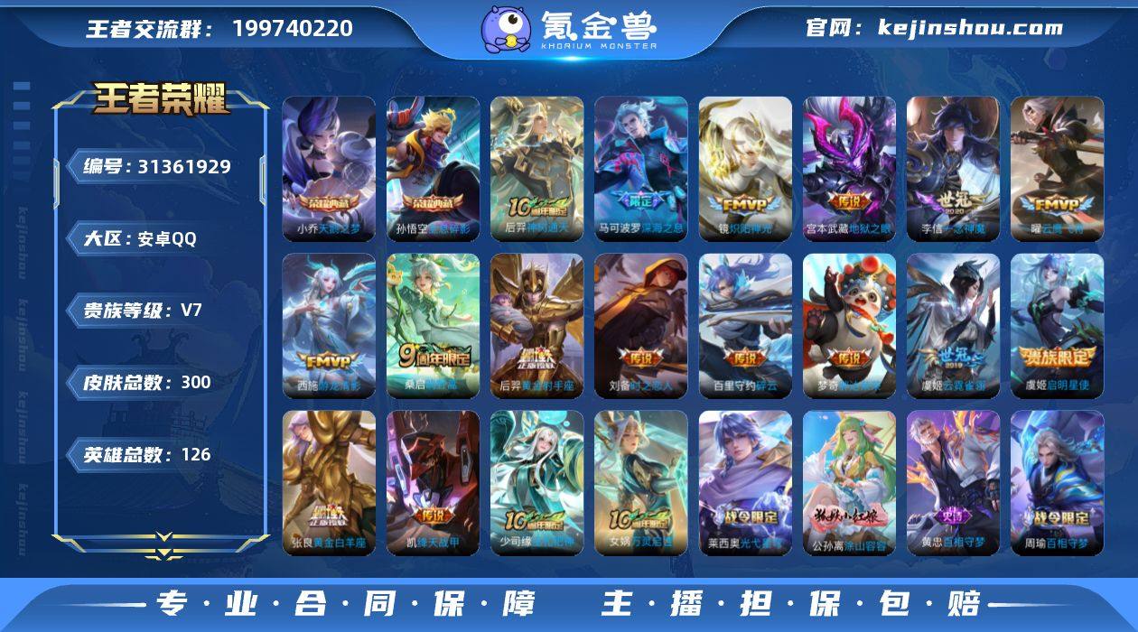 安卓Q-V7-最强王者段位-126英雄-300皮肤-2典藏皮肤-16传说-77史诗 【英雄全皮】:孙权全皮,蒙恬全皮 【荣耀典藏】:孙悟空全息碎影,小乔天鹅之梦 【传说皮肤】:后羿神树通天,桑启鸣野蒿,百里守约碎云,马可波罗深海之息,西施游龙清影,铠绛天战甲,镜炽阳神光,虞姬启明星使,曜云鹰飞将,李信一念神魔,刘备时之恋人,张良黄金白羊座,虞姬云霓雀翎,梦奇胖达荣荣,后羿黄金射手座,宫本武藏地狱之眼 【限定皮肤】:蔡文姬夏日便利店,虞姬夏日便利店,姜子牙天穹之誓,狄仁杰阴阳师,赵云皇家上将,孙尚香蔷薇恋人,扁鹊奇幻香踪,夏侯惇朔风刀,典韦穷奇,马可波罗深海之息,狄仁杰魔术师,狄仁杰万华元夜,达摩星际陆战队,项羽海滩派对,老夫子醍醐杖,程咬金演武夺筹,王昭君午后时光,兰陵王金庭之子,孙悟空至尊宝,虞姬启明星使,钟馗驱傩正仪,杨戬潮玩骑兵,鬼谷子原初探秘者,弈星混沌棋,沈梦溪大漠名商,明世隐疑决卦,裴擒虎擒涛扼浪,狂铁电玩高手,云中君纤云弄巧,盾山御銮,嫦娥拒霜思,西施玲珑珍味,鲁班大师探海日志,桑启海盐诗旅,戈娅驭风魔法,艾琳流音漫舞,司空震地狱燃心,阿古朵江河有灵,张良古海寻踪,蒙犽百解令,蒙恬荣光圣徽,鬼谷子天穹祈灯,刘邦剑破天穹,程咬金群星魔术团,镜青焰无极,周瑜熔金海岸 【赛季限定】:夏侯惇朔风刀,典韦穷奇,狄仁杰万华元夜,老夫子醍醐杖,程咬金演武夺筹,兰陵王金庭之子,张良古海寻踪,钟馗驱傩正仪,鬼谷子原初探秘者,弈星混沌棋,沈梦溪大漠名商,明世隐疑决卦,裴擒虎擒涛扼浪,盾山御銮,鲁班大师探海日志,桑启海盐诗旅,鬼谷子天穹祈灯,蒙恬荣光圣徽,刘邦剑破天穹,姜子牙天穹之誓 【战令限定】:蔡文姬夏日便利店,虞姬夏日便利店,扁鹊奇幻香踪,达摩星际陆战队,王昭君午后时光,艾琳流音漫舞,杨戬潮玩骑兵,狂铁...