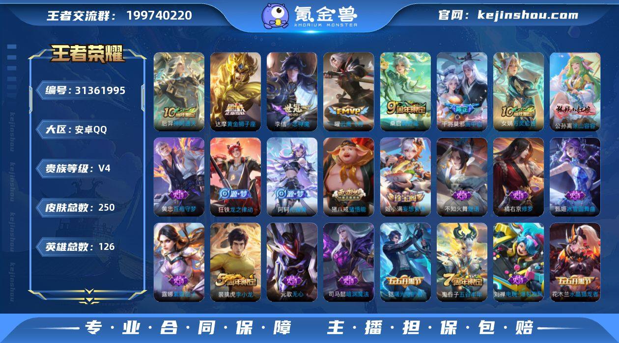 安卓Q-V4-最强王者段位-126英雄-250皮肤-6传说-57史诗 【英雄全皮】:鬼谷子全皮,蒙恬全皮,影全皮 【传说皮肤】:后羿神树通天,桑启鸣野蒿,干将莫邪画中仙,曜云鹰飞将,李信一念神魔,达摩黄金狮子座 【限定皮肤】:大乔绒语心约,姜子牙天穹之誓,杨戬破阵退雄兵,狄仁杰阴阳师,赵云皇家上将,孙尚香蔷薇恋人,庄周高山流水,高渐离死亡摇滚,高渐离玩趣恶龙,元歌无心,夏侯惇朔风刀,甄姬游园惊梦,典韦穷奇,狄仁杰魔术师,狄仁杰万华元夜,达摩沙漠行僧,项羽海滩派对,老夫子醍醐杖,关羽百相守梦,程咬金演武夺筹,兰陵王金庭之子,牛魔御旌,李元芳云中旅人,钟馗驱傩正仪,杨玉环遇见飞天,干将莫邪画中仙,雅典娜黎明之约,鬼谷子原初探秘者,鬼谷子五谷丰年,苏烈千军破阵,百里玄策原初追逐者,弈星混沌棋,梦奇顽趣,沈梦溪大漠名商,明世隐疑决卦,裴擒虎李小龙,裴擒虎擒涛扼浪,狂铁御狮,米莱狄御霄,盾山御銮,猪八戒猪悟能,上官婉儿梁祝,鲁班大师探海日志,桑启海盐诗旅,阿古朵江河有灵,张良古海寻踪,蒙犽百解令,蒙恬荣光圣徽,鬼谷子天穹祈灯,姬小满妄想食味,沈梦溪龙舞盛年,刘邦剑破天穹,程咬金群星魔术团,周瑜熔金海岸 【赛季限定】:夏侯惇朔风刀,典韦穷奇,狄仁杰万华元夜,达摩沙漠行僧,老夫子醍醐杖,程咬金演武夺筹,兰陵王金庭之子,张良古海寻踪,牛魔御旌,李元芳云中旅人,钟馗驱傩正仪,雅典娜黎明之约,鬼谷子原初探秘者,苏烈千军破阵,百里玄策原初追逐者,弈星混沌棋,梦奇顽趣,沈梦溪大漠名商,明世隐疑决卦,裴擒虎擒涛扼浪,狂铁御狮,米莱狄御霄,盾山御銮,鲁班大师探海日志,桑启海盐诗旅,鬼谷子天穹祈灯,蒙恬荣光圣徽,刘邦剑破天穹,姜子牙天穹之誓 【史诗皮肤】:露娜紫霞仙子,赵云皇家上将,赵云未来纪元,貂蝉圣诞恋歌,甄姬冰雪圆舞曲,...