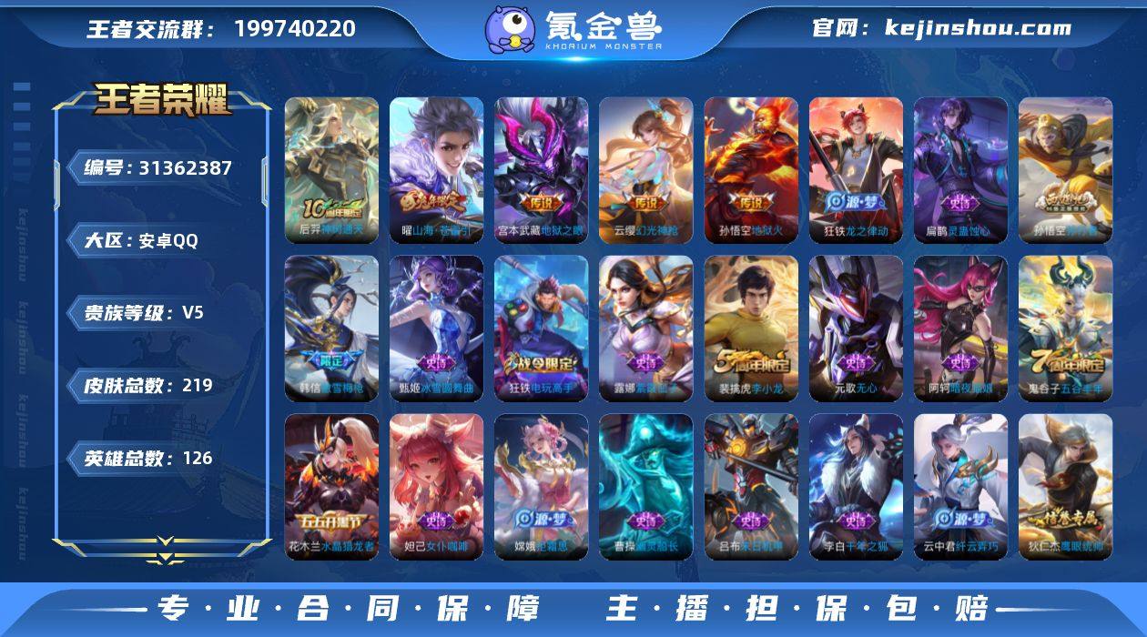 安卓Q-V5-最强王者段位-126英雄-219皮肤-5传说-53史诗 【英雄全皮】:狂铁全皮 【传说皮肤】:后羿神树通天,云缨幻光神枪,曜山海苍雷引,宫本武藏地狱之眼,孙悟空地狱火 【限定皮肤】:狄仁杰阴阳师,赵云皇家上将,嬴政优雅恋人,庄周高山流水,高渐离死亡摇滚,高渐离玩趣恶龙,钟无艳超时空战士,芈月幻夜卜梦,元歌无心,夏侯惇朔风刀,甄姬游园惊梦,甄姬落雪兰心,狄仁杰万华元夜,达摩沙漠行僧,项羽海滩派对,老夫子醍醐杖,程咬金演武夺筹,韩信傲雪梅枪,王昭君午后时光,兰陵王金庭之子,孙悟空孙行者,牛魔御旌,李元芳云中旅人,钟馗驱傩正仪,杨玉环遇见飞天,干将莫邪胡桃夹子,雅典娜黎明之约,太乙真人华丽摇滚,鬼谷子原初探秘者,鬼谷子五谷丰年,黄忠火炮绅士,苏烈千军破阵,百里玄策原初追逐者,弈星混沌棋,梦奇顽趣,沈梦溪大漠名商,明世隐疑决卦,裴擒虎李小龙,裴擒虎擒涛扼浪,狂铁御狮,狂铁电玩高手,米莱狄御霄,云中君纤云弄巧,盾山御銮,嫦娥拒霜思,曜山海苍雷引,鲁班大师探海日志,桑启海盐诗旅,阿古朵江河有灵,张良古海寻踪,蒙恬荣光圣徽,高渐离燃音魔法,妲己灵卜魔法,鬼谷子天穹祈灯,沈梦溪龙舞盛年,刘邦剑破天穹,程咬金群星魔术团 【年限皮肤】:曜山海苍雷引 【赛季限定】:夏侯惇朔风刀,狄仁杰万华元夜,达摩沙漠行僧,老夫子醍醐杖,程咬金演武夺筹,兰陵王金庭之子,张良古海寻踪,牛魔御旌,李元芳云中旅人,钟馗驱傩正仪,雅典娜黎明之约,鬼谷子原初探秘者,苏烈千军破阵,百里玄策原初追逐者,弈星混沌棋,梦奇顽趣,沈梦溪大漠名商,明世隐疑决卦,裴擒虎擒涛扼浪,狂铁御狮,米莱狄御霄,盾山御銮,鲁班大师探海日志,桑启海盐诗旅,鬼谷子天穹祈灯,蒙恬荣光圣徽,刘邦剑破天穹 【战令限定】:钟无艳超时空战士,芈月幻夜卜梦,甄姬落雪兰心,王...