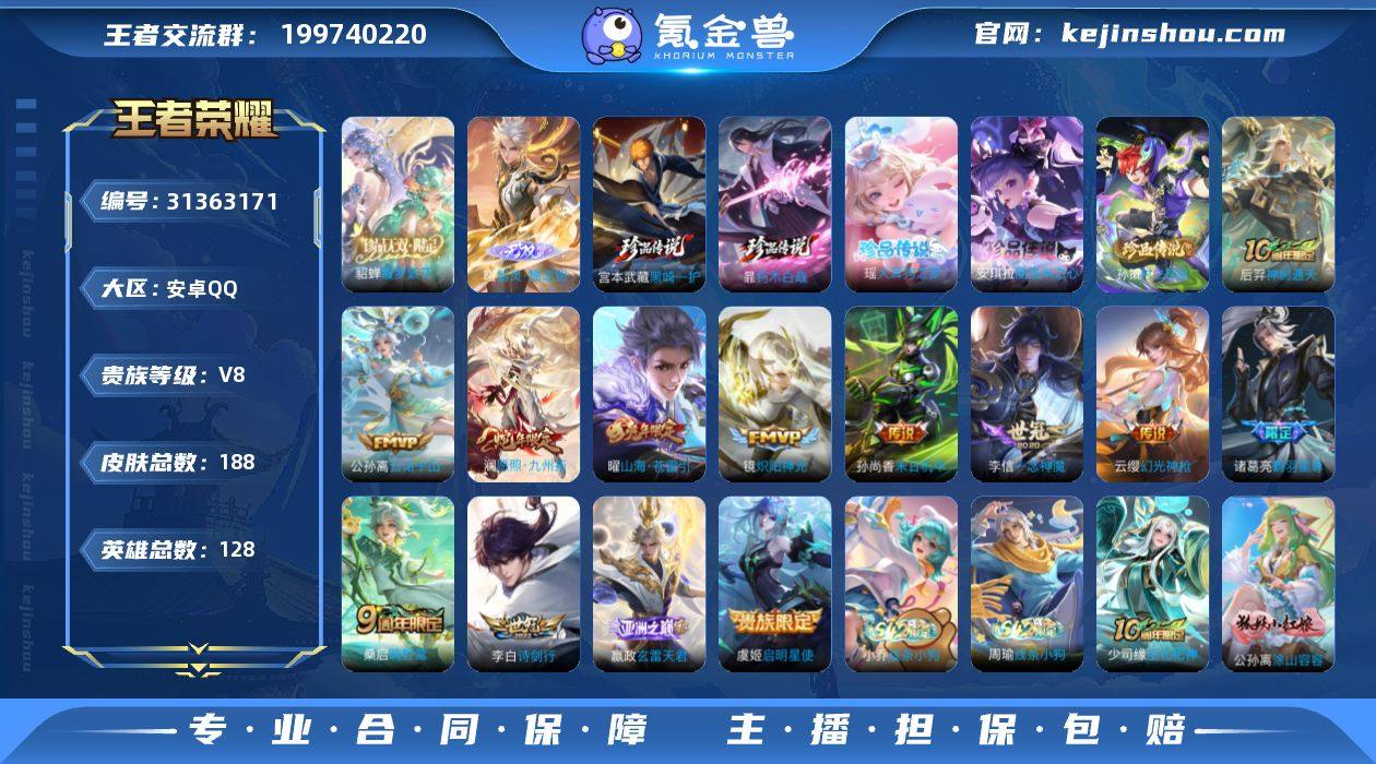 安卓Q-V8-永恒钻石III段位-128英雄-188皮肤-1珍品无双-1无双-5珍品传说-13传说-52史诗 【英雄全皮】:孙权全皮,影全皮 【珍品无双】:貂蝉馥梦繁花 【无双皮肤】:曜器灵螭龙剑 【珍品传说】:孙策时之奇旅,瑶大耳狗之梦,安琪拉酷洛米之心,暃朽木白哉,宫本武藏黑崎一护 【传说皮肤】:后羿神树通天,公孙离云诺千山,澜愿照九州拓,云缨幻光神枪,嬴政玄雷天君,桑启鸣野蒿,诸葛亮鹤羽星尊,曜山海苍雷引,李白诗剑行,镜炽阳神光,虞姬启明星使,李信一念神魔,孙尚香末日机甲 【限定皮肤】:白起狰,狄仁杰阴阳师,赵云皇家上将,孙尚香蔷薇恋人,吕布猎兽之王,元歌无心,马可波罗山海玄木吟,狄仁杰魔术师,狄仁杰万华元夜,达摩沙漠行僧,项羽海滩派对,老夫子醍醐杖,老夫子航海奇遇记,王昭君午后时光,兰陵王金庭之子,孙悟空至尊宝,牛魔御旌,李元芳云中旅人,虞姬启明星使,钟馗驱傩正仪,鬼谷子五谷丰年,诸葛亮鹤羽星尊,沈梦溪大漠名商,裴擒虎擒涛扼浪,狂铁电玩高手,云中君纤云弄巧,上官婉儿天狼绘梦者,曜山海苍雷引,鲁班大师探海日志,桑启海盐诗旅,张良古海寻踪,高渐离燃音魔法,妲己灵卜魔法,鬼谷子天穹祈灯,百里玄策超元猎域,沈梦溪龙舞盛年,刘邦剑破天穹 【年限皮肤】:曜山海苍雷引,马可波罗山海玄木吟,澜愿照九州拓 【赛季限定】:白起狰,牛魔御旌,老夫子醍醐杖,狄仁杰万华元夜,钟馗驱傩正仪,达摩沙漠行僧,兰陵王金庭之子,沈梦溪大漠名商,李元芳云中旅人,桑启海盐诗旅,裴擒虎擒涛扼浪,鲁班大师探海日志,张良古海寻踪,鬼谷子天穹祈灯,刘邦剑破天穹,东皇太一噬灭天穹,太乙真人谧流熔炉,钟馗虚灵犬护,甄姬逆浪荇歌 【战令限定】:吕布猎兽之王,老夫子航海奇遇记,狂铁电玩高手,王昭君午后时光,高渐离燃音魔法,妲己灵卜魔法,百里守约百相守梦,老夫...