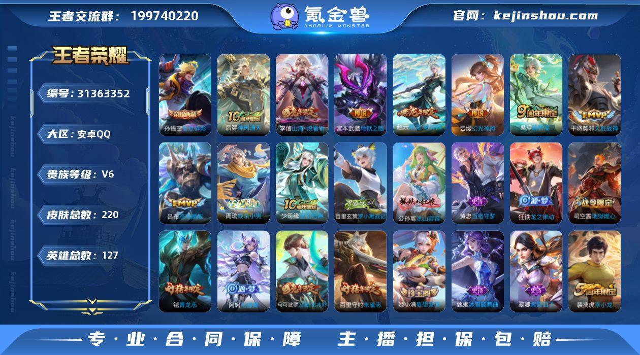 安卓Q-V6-永恒钻石III段位-127英雄-220皮肤-1典藏皮肤-8传说-61史诗 【荣耀典藏】:孙悟空全息碎影 【传说皮肤】:后羿神树通天,云缨幻光神枪,桑启鸣野蒿,赵云乘龙铭钟鼎,李信山海炽霜斩,吕布怒海麟威,干将莫邪久胜战神,宫本武藏地狱之眼 【限定皮肤】:姜子牙天穹之誓,杨戬破阵退雄兵,狄仁杰阴阳师,赵云皇家上将,孙尚香蔷薇恋人,庄周高山流水,高渐离玩趣恶龙,元歌无心,马可波罗山海玄木吟,狄仁杰魔术师,狄仁杰万华元夜,达摩沙漠行僧,项羽海滩派对,老夫子醍醐杖,程咬金演武夺筹,兰陵王金庭之子,李元芳云中旅人,钟馗驱傩正仪,雅典娜黎明之约,太乙真人华丽摇滚,鬼谷子原初探秘者,鬼谷子五谷丰年,铠青龙志,苏烈千军破阵,百里玄策原初追逐者,百里守约朱雀志,梦奇顽趣,沈梦溪大漠名商,裴擒虎李小龙,裴擒虎擒涛扼浪,云中君纤云弄巧,李信山海炽霜斩,上官婉儿梁祝,嫦娥拒霜思,西施玲珑珍味,鲁班大师探海日志,桑启海盐诗旅,戈娅驭风魔法,艾琳流音漫舞,司空震地狱燃心,阿古朵江河有灵,张良古海寻踪,蒙犽百解令,蒙恬荣光圣徽,鬼谷子天穹祈灯,姬小满妄想食味,赵云乘龙铭钟鼎,刘邦剑破天穹,周瑜熔金海岸 【年限皮肤】:百里守约朱雀志,铠青龙志,李信山海炽霜斩,马可波罗山海玄木吟,赵云乘龙铭钟鼎 【赛季限定】:老夫子醍醐杖,鬼谷子原初探秘者,狄仁杰万华元夜,程咬金演武夺筹,钟馗驱傩正仪,苏烈千军破阵,达摩沙漠行僧,兰陵王金庭之子,沈梦溪大漠名商,李元芳云中旅人,桑启海盐诗旅,裴擒虎擒涛扼浪,鲁班大师探海日志,张良古海寻踪,鬼谷子天穹祈灯,刘邦剑破天穹,姜子牙天穹之誓,东皇太一噬灭天穹,甄姬逆浪荇歌,亚瑟荣光之誓,百里玄策原初追逐者,雅典娜黎明之约,梦奇顽趣,蒙恬荣光圣徽,牛魔星界战将 【战令限定】:戈娅驭风魔法,西施玲珑珍...