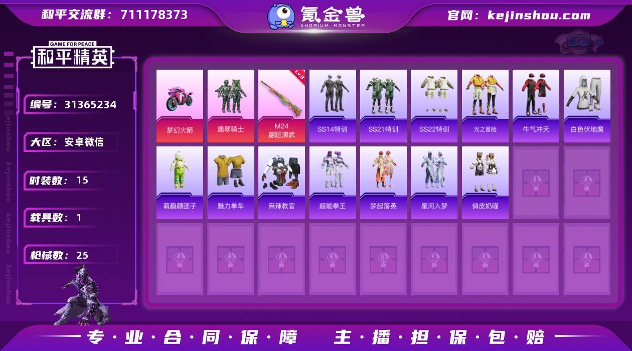 安卓 微信-社交永久限制24号钱包可改 1粉装-1特效枪-1载具-1粉色飞行器-9251热力值-0王牌印记-15套装-25枪皮 【粉色套装】:粉装-翡翠骑士 【粉色枪皮等级】:M24-翩跹演武(三级) 【粉色载具】:双人摩托-梦幻火箭 【粉色枪皮】:M24-翩跹演武 【粉色飞行器】:梦幻火箭飞行器 【粉色降落伞】:梦幻火箭降落伞,翩跹演武降落伞,彩虹甜喵降落伞 【稀有枪皮】:AKM-夜灯,AKM-萌趣颜团子,SCAR-L-玉兔迎春,GROZA-彩虹符号,G36C-绮梦青鸾,AC-VAL-天降萌叽,AC-VAL-彩虹甜喵,UZI-烈焰拳霸,UMP45-夜灯,Vector-夜灯,野牛-王牌四分卫,Kar98K-梦幻火箭,Mini14-梦幻火箭,S686-生命誓言,S1897-炫彩节奏,DBS-彩虹甜喵,M249-糯团青竹,DP-28-彩虹符号 【其他套装】:套装-SS14特训,套装-SS21特训,套装-SS22特训,套装-光之冒险,套装-牛气冲天,套装-白色伏地魔,套装-萌趣颜团子,套装-魅力单车,套装-麻辣教官,套装-超能拳王,套装-梦起落英,套装-星河入梦,套装-俏皮奶喵 【稀有头盔】:梦幻火箭头盔(3级),梦幻火箭头盔(2级),梦幻火箭头盔(1级) 【稀有背包】:梦幻火箭背包(3级),梦幻火箭背包(2级),梦幻火箭背包(1级) 【营地ID】:923008694