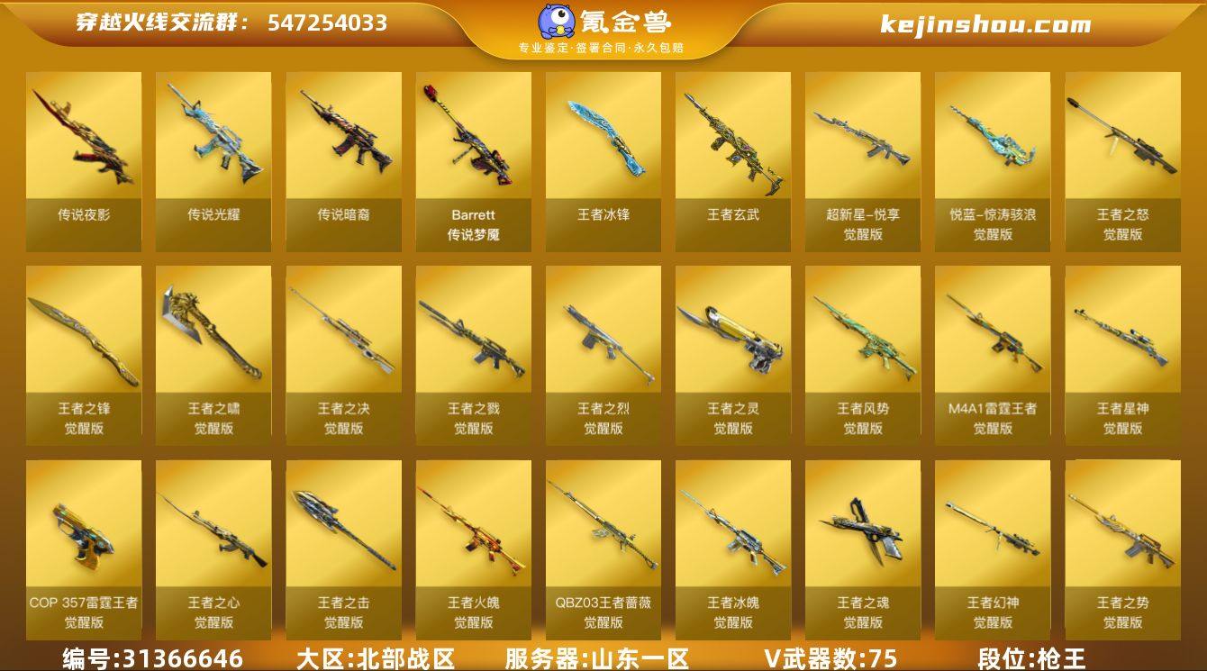 段位:枪王 VIP等级:VIP6 V武器数:75 王者武器数:30 传说暗裔,传说光耀,传说梦魇,传说夜影 王者冰锋,王者玄武,超新星-悦享-觉醒版,悦蓝-惊涛骇浪-觉醒版,王者之怒-觉醒版,王者之锋-觉醒版,王者之啸-觉醒版,王者之决-觉醒版,王者之戮-觉醒版,王者之烈-觉醒版,王者之灵-觉醒版,王者风势-觉醒版,M4A1-雷霆王者-觉醒版,王者星神-觉醒版,COP 357-雷霆王者-觉醒版,王者之心-觉醒版,王者之击-觉醒版,王者火魄-觉醒版,QBZ-03-王者蔷薇-觉醒版,王者冰魄-觉醒版,王者之魂-觉醒版,王者幻神-觉醒版,王者之势-觉醒版,王者之影-觉醒版,王者之光-觉醒版,王者青龙,王者凤吟,王者之霆 EVOⅢ-萌杀,柯尔特-萌杀,M200-玄龙,M4A1-水晶,神圣爆裂者-末日III,机械迷城-穹宇,FAMAS G2-天戎,死神-雪域霜狐,M4A1-赤狱骑士,QBZ191-银翼,无影-神兵利器,AK47-B-身先士卒,USP-小动物,炼狱-风暴,COP-堕天神,Glock18-武圣,麒麟刺-堕天神,龙啸-堕天神,VSK-94-金蚀,AK47-火麒麟,AK47-无影,AK47-黑鲨,AK47-黑武士,AK47-机械迷城,M4A1-雷神,M4A1-黑骑士,M4A1-黑龙,M4A1-夜魔,M4A1-青龙,M4A1-武圣,M4A1-千变,M4A1-猎神,M200-幻神,Barrett-毁灭,Barrett-极光,Barrett-朱雀,AWM-天龙,Kar98k-星神,AK12-天启,AN94-超新星,QBZ03-金色蔷薇,Scar Light-白虎,9A91-烈火,屠龙,麒麟刺,擎天,M200-竞技荣光,柯尔特-荣耀世冠,柯尔特-竞技荣光,USP-雷暴,擎天-竞技荣光,龙啸-荣耀世冠,AK47-B-常胜将军,幻灵之锋,AK47-B-战士,裁决,天神,柯尔特-冠军之特,破空枪刃-夜魔,G36C-幻影,烈火-动感闪耀,天神-动感闪耀,屠龙-动感闪耀,擎天-云海游龙,M4A1-苍鸣雷神,Barrett-碧霄极光 传说艾莉莎 王者葵-惊若翩鸿,王者-零-传说之路,王者涂鸦,王者炫,王者樱-热浪之夏 电竞教官-云悠悠,葵,零·纪元,晴雅,隼,瞳,樱,研,战地猎狐,职业选手 死神-雪域霜狐-怀旧音效卡,M4A1-雷神-怀旧音效卡,M200-幻神音效卡,AWM-裁决音效卡,M4A1-黑骑士音效卡,Barrett-毁灭音效卡,AK47-火麒麟音效卡 卖家说:还有安卓qq王者号。V10有457个皮肤