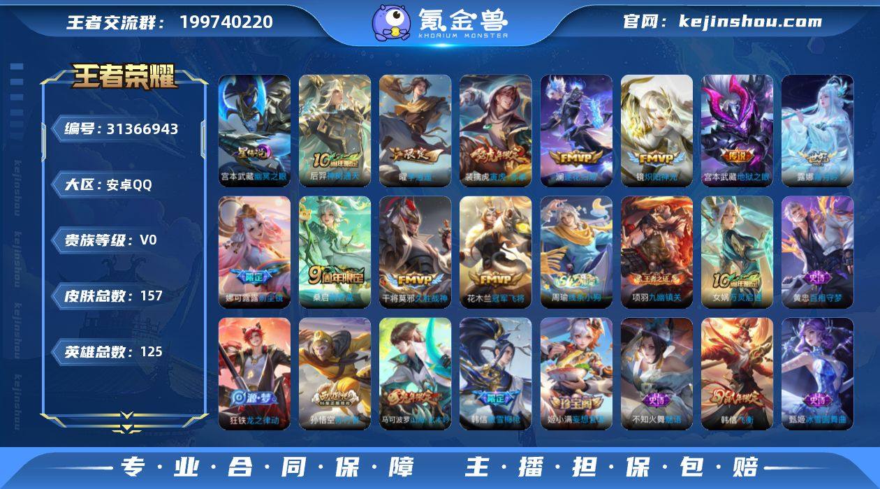 贵族1级 157皮肤,11传说,2星元,51史诗,41段打野,3个性按键, 【传说皮肤11】 后羿神树通天 桑启鸣野蒿 澜逐花归海 露娜霜月吟 娜可露露前尘镜 裴擒虎寅虎赤拳 曜李逍遥 镜炽阳神光 干将莫邪久胜战神 花木兰冠军飞将 宫本武藏地狱之眼; 【星元皮肤2】 宫本武藏幽冥之眼 百里玄策元气满满鸭; 【史诗皮肤51】 项羽九幽镇关 黄忠百相守梦 狂铁龙之律动 蔡文姬夏日便利店 女娲万灵启世 牛魔星界战将 姬小满妄想食味 蒙恬荣光圣徽 蒙犽百解令 阿古朵江河有灵 马可波罗山海玄木吟 梦奇顽趣 元歌无心 鬼谷子五谷丰年 澜赏金猎手 韩信傲雪梅枪 雅典娜黎明之约 庄周高山流水 孙悟空孙行者 西施诗语江南 裴擒虎李小龙 百里玄策原初追逐者 不知火舞魅语 韩信飞衡 大乔猫狗日记 白起星夜王子 程咬金功夫厨神 李元芳逐浪之夏 百里守约特工魅影 亚瑟心灵战警 诸葛亮黄金分割率 夏侯惇乘风破浪 花木兰水晶猎龙者 吕布末日机甲 雅典娜冰冠公主 李白千年之狐 廉颇地狱岩魂 赵云皇家上将 墨子金属风暴 孙尚香水果甜心 孙尚香蔷薇恋人 吕布圣诞狂欢 甄姬冰雪圆舞曲 宫本武藏鬼剑武藏 狄仁杰魔术师 貂蝉圣诞恋歌 露娜紫霞仙子 王昭君偶像歌手 狄仁杰鹰眼统帅 姬小满妄想食味 孙尚香蔷薇恋人; 【年限皮肤3】 裴擒虎寅虎赤拳 马可波罗山海玄木吟 韩信飞衡; 【内测皮肤4】 姬小满妄想食味 孙尚香蔷薇恋人 姬小满妄想食味 孙尚香蔷薇恋人; 【个性按键3】 神树通天 布丁狗之约 炽阳神光; 【主页装扮14】 元流之子 沙海飞舟 幻海映月 火鹰传说 东方来客 玉城之子 漂泊之剑 命运和弦 云梦有灵 命归缘起 群星启明 穿透信念 巅峰之路 命若星火; 【稀有英雄8】 _艾琳; _赵云; _韩信; _不知火舞; _娜可露露; _橘右京; _夏洛特; _敖隐;【138区】【可二次实名】【安卓QQ】【赛季】【国标、皮肤等详细信息以游戏内验号为准