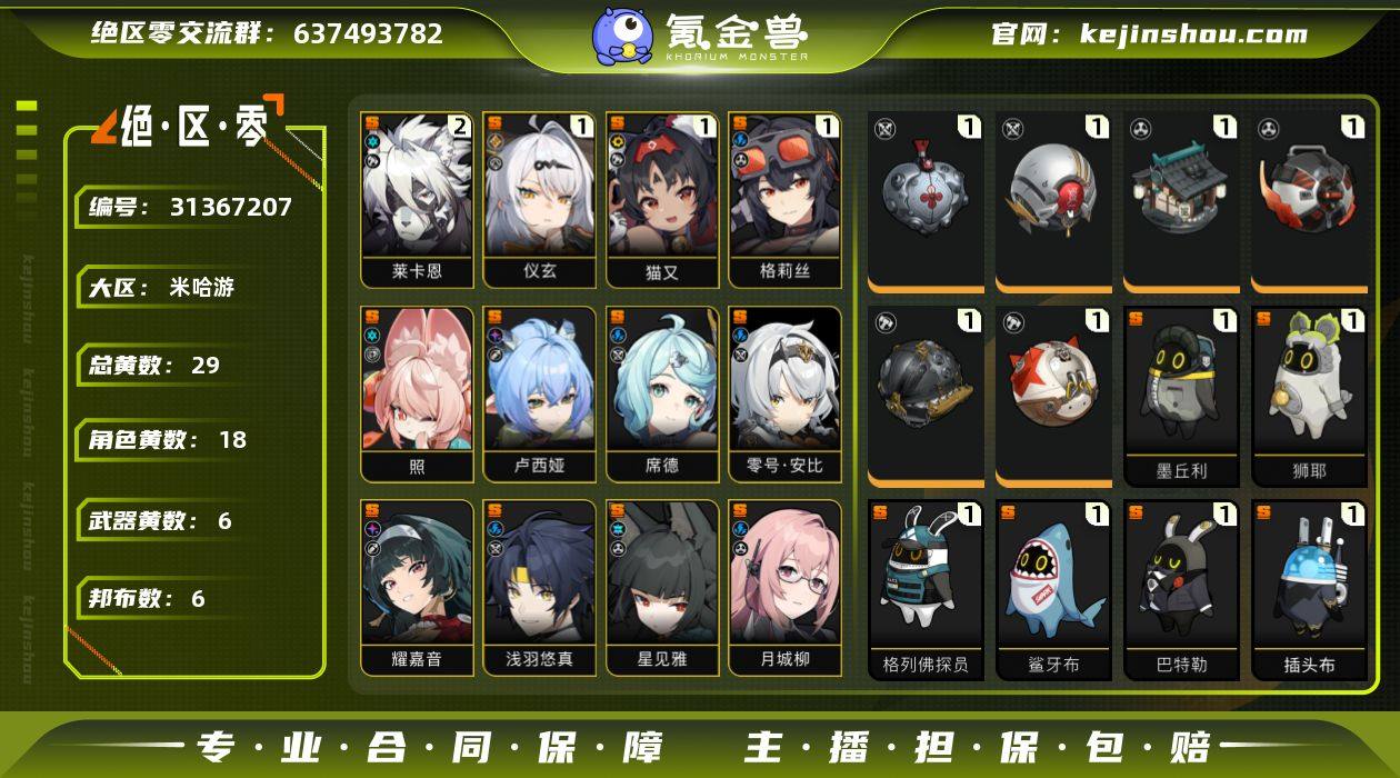 冒险等级:59 总黄数:29 五星角色数:18 菲林底片数量:67 菲林数量:280 加密母带数量:5 2命莱卡恩,1命仪玄,1命猫又,1命格莉丝,0命照,0命卢西娅,0命席德,0命零号·安比,0命耀嘉音,0命浅羽悠真,0命星见雅,0命月城柳,0命柏妮思·怀特,0命简,0命艾莲,0命丽娜,0命「11号」,0命珂蕾妲 6命波可娜,6命赛斯,6命露西,6命苍角,6命派派,6命比利,6命本,6命安比,6命妮可,6命安东,6命可琳,1命潘引壶,0命真斗 1精机巧心种,1精牺牲洁纯,1精霰落星殿,1精嵌合编译器,1精拘缚者,1精燃狱齿轮 1精墨丘利,1精狮耶,1精格列佛探员,1精鲨牙布,1精巴特勒,1精插头布 白心旧影,从周一到周五,狡黠甜心,墨形影踪,晴澜双迹套装,水晶灯下,漪光夜曲 卖家说:师傅一命,主c全毕业面板,好感度全满